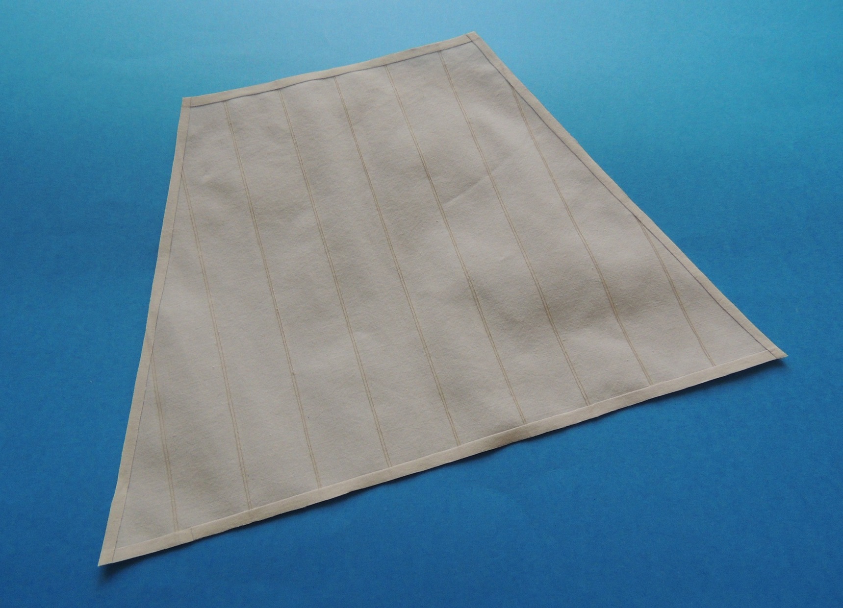 Wykonałem pierwszy żagielek. W zasadzie wszystko widać na zdjęciach. Pocięte paski materiału sklejam klejem do drewna, na zakładkę, ok. 1 mm.Takiej metody jeszcze nie spotkałem. Być może, komuś, kto nie posiada maszyny do szycia, taka metoda się spodoba. Ja jeszcze nie wiem, czy mi się podoba, czy nie.