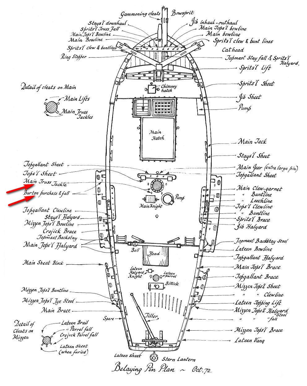 Jak wcześniej napisałem, zaczynam zabawę z olinowaniem.Chciałbym je w miarę dokładnie wykonać i będę miał sporo pytań. Na początek dwa elementy olinowania stałego(tak mi się wydaje), zaznaczone na pierwszym zdjęciu. Na pozostałych zdjęciach pozaznaczałem, które to liny.