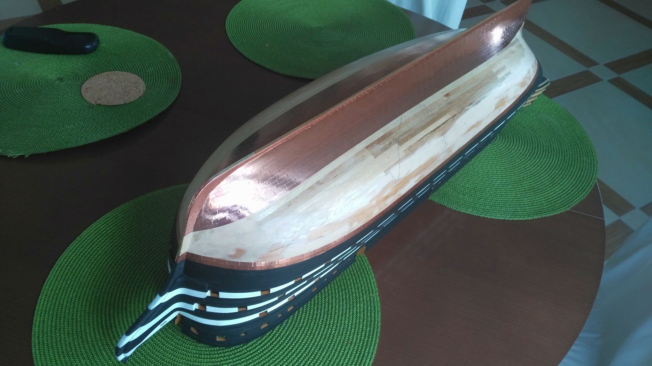 Prace przy miedziowaniu posuwają się pomału do przodu. Używam do tego celu taśmy "Master Foil Plus" z przeźroczystym klejem. Na uprzednio polakierowanym 2 razy i oczyszczonym podłożu trzyma bardzo dobrze, jedynie w miejscach gdzie dotykałem klej palcami jest trochę słabiej.