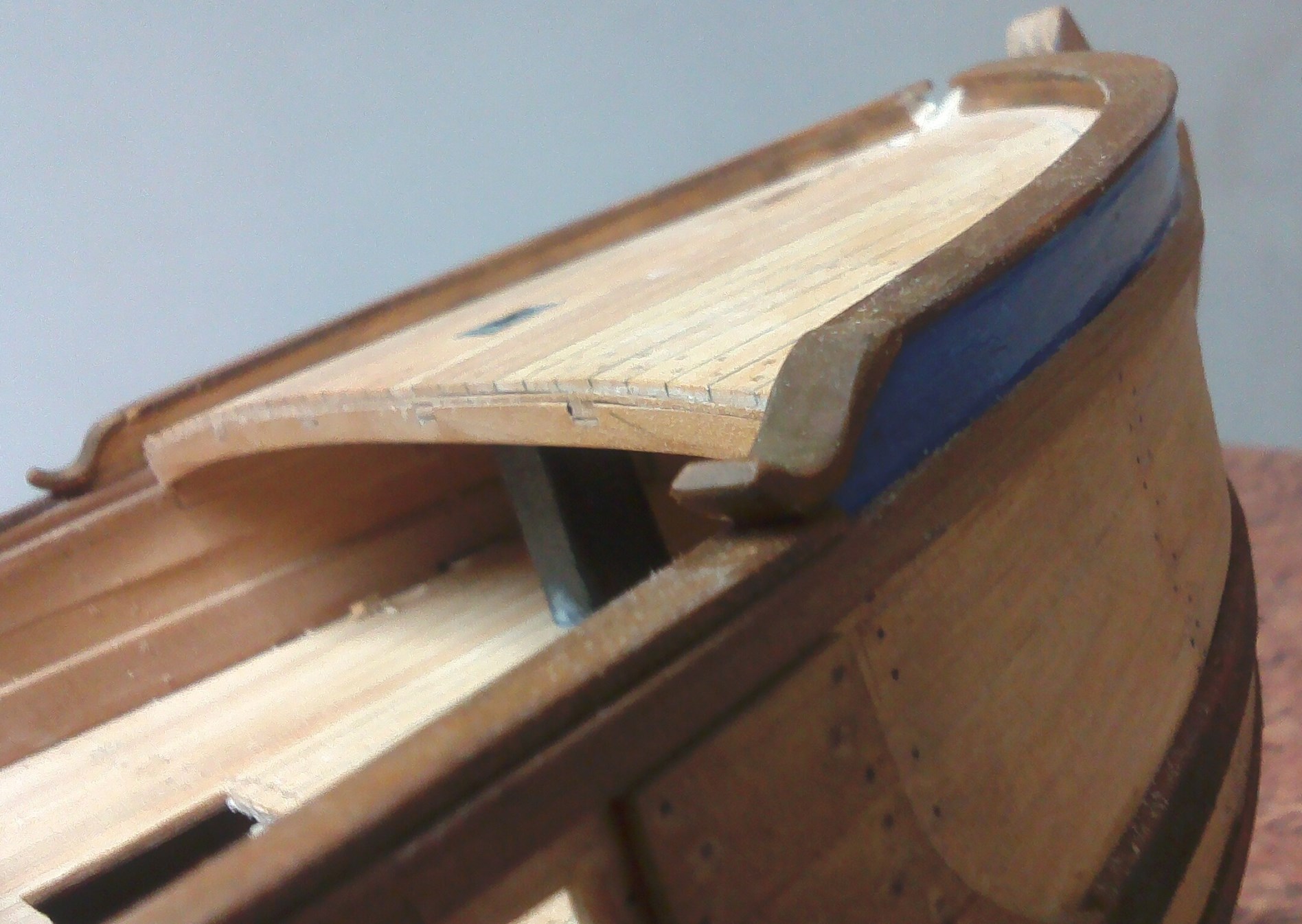 I jeszcze mała uwaga dotycząca pokładu. Zapewne modelarscy konserwatyści podniosą lament, ale pomalowałem pokład matowym lakierem bezbarwnym. Przy Batavii zastosowałem olej lniany, który bardzo zróżnicował odcienie klepek. Użycie lakieru dało w przypadku listewek brzozowych, które zastosowałem, znacznie lepszy efekt. ;)
