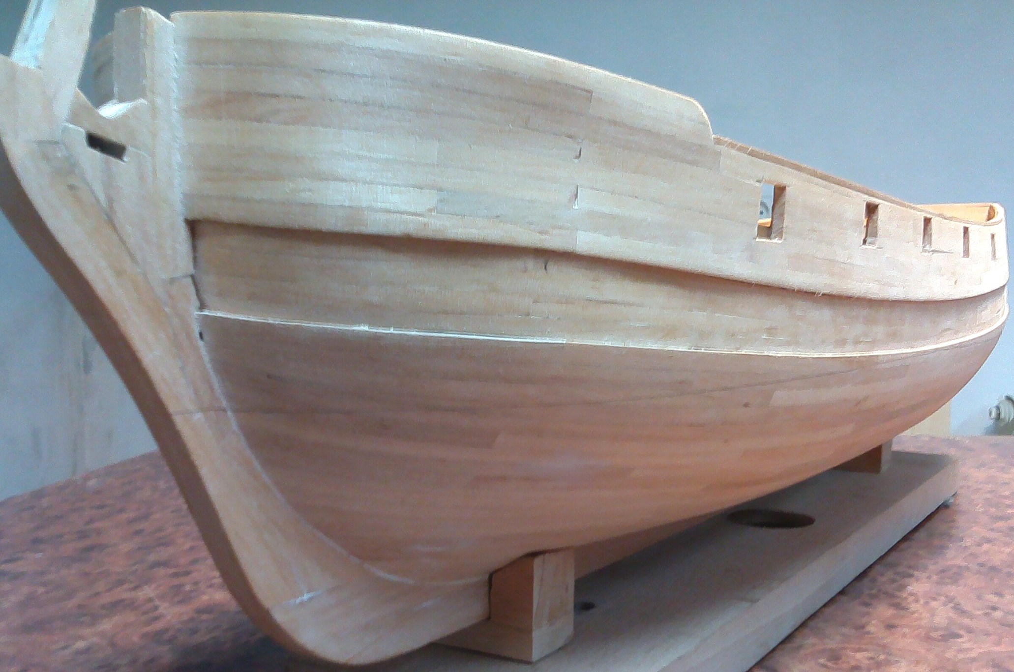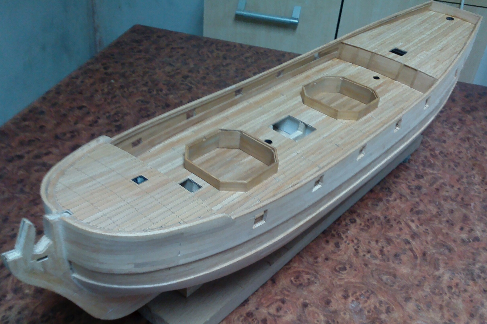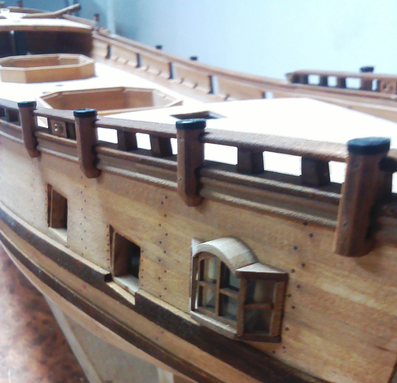 I jeszcze mała uwaga dotycząca pokładu. Zapewne modelarscy konserwatyści podniosą lament, ale pomalowałem pokład matowym lakierem bezbarwnym. Przy Batavii zastosowałem olej lniany, który bardzo zróżnicował odcienie klepek. Użycie lakieru dało w przypadku listewek brzozowych, które zastosowałem, znacznie lepszy efekt. ;)