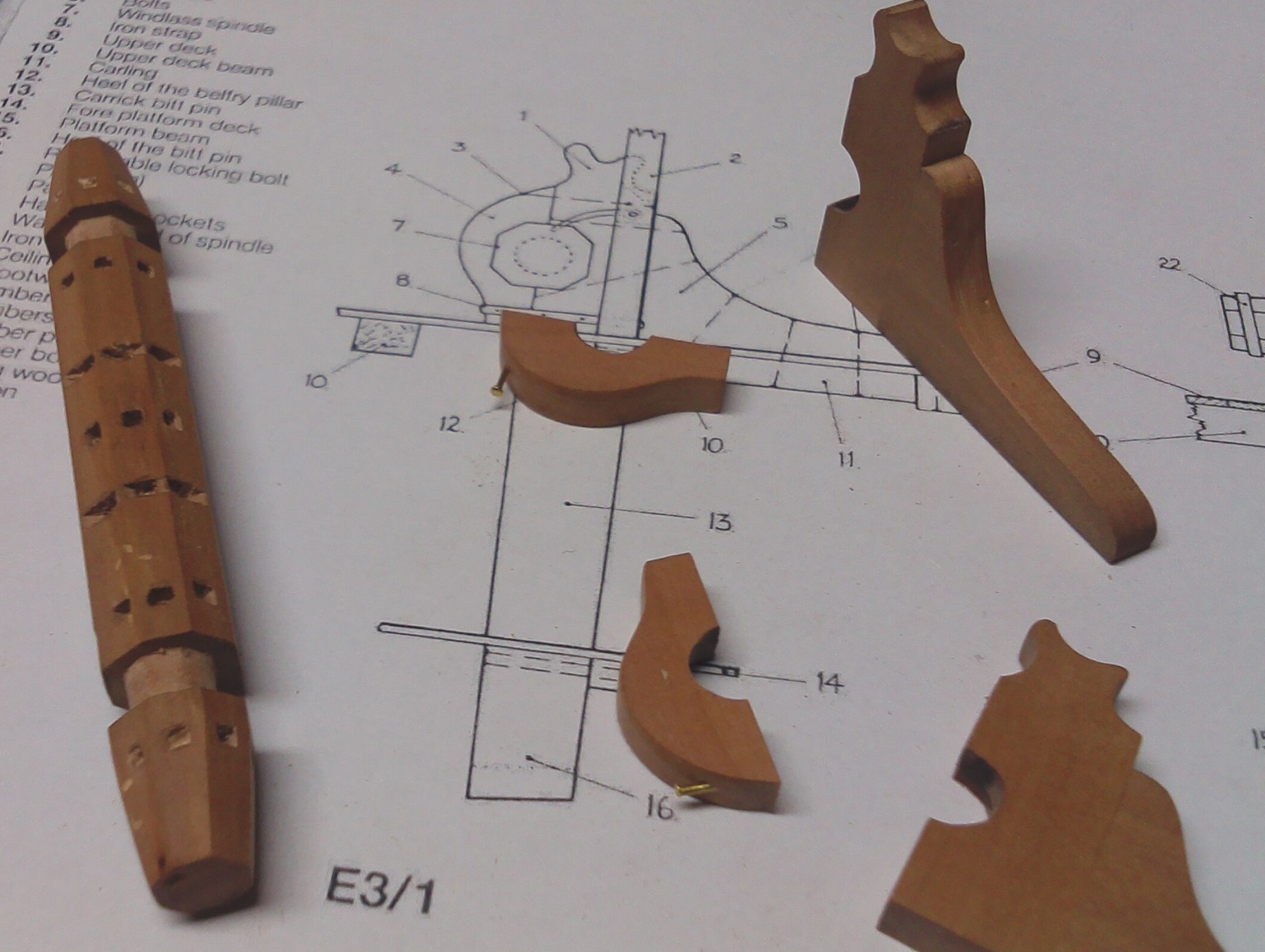 Trochę mimochodem powstał kabestan. Części składowe; wrzeciono z jednego kawałka drewna: