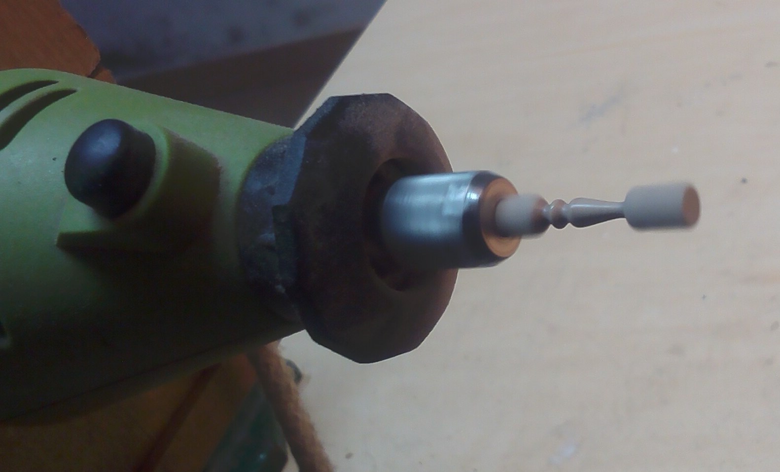 Przeglądając relacje na Kodze, zauważyłem, że niektórzy koledzy mają problem z wytoczeniem drobnych detali. Chodzi głównie o nagle. Ja wykonuję takie detale z pomocą dwóch mini wiertarek; do jednej z nich (stacjonarnej) mocuję kawałek drewna, a do drugiej (trzymanej w ręce) tarczę ścierną. Wykonany w ten sposób element poleruję drobnym papierem ściernym: