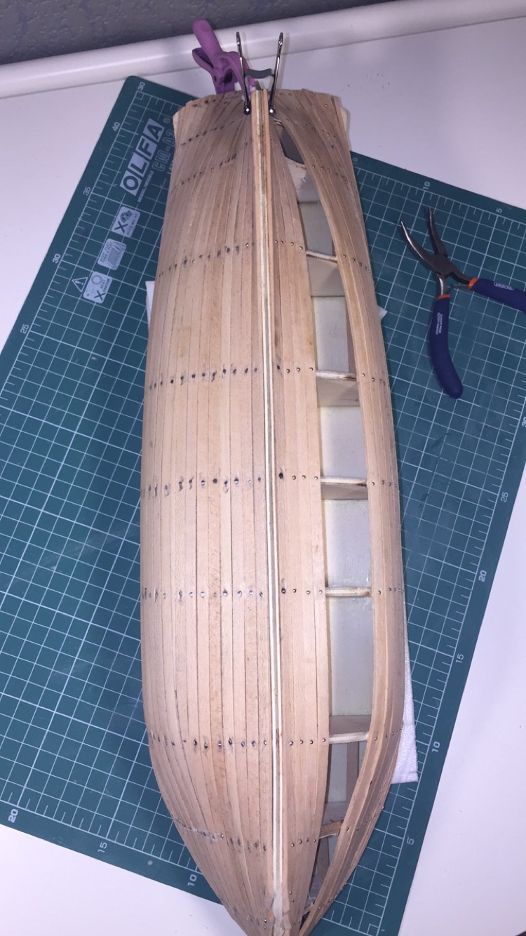 Dzięki Krzysiek za podpowiedź, wręgi podszlifuję. Jak na razie żadna z listewek nie jest nadłamana, lekko krawędzie burt ( mogłem zaczekać na giętarkę ) , ale to pokryje warstwa poszycia.