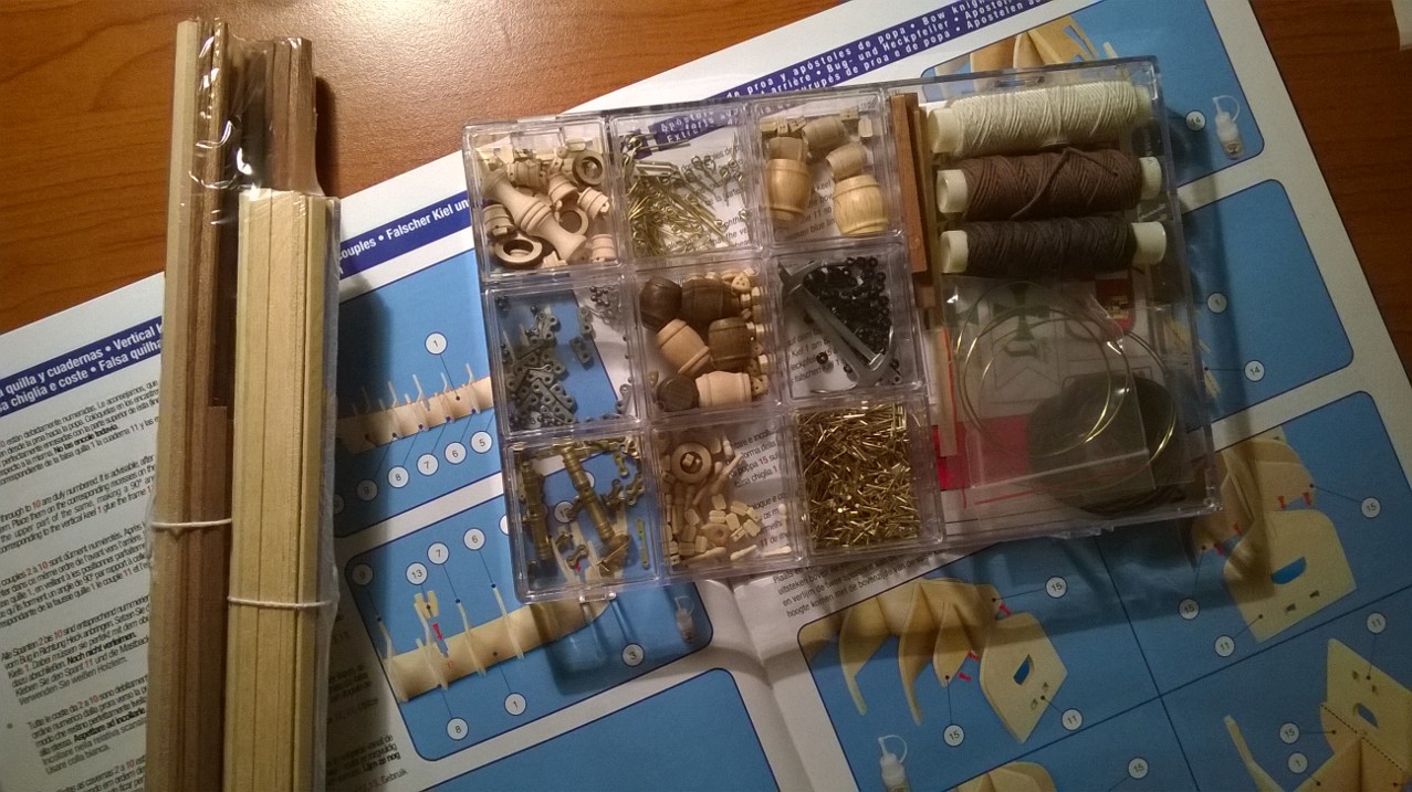 Pierwsze wrażenie po otworzeniu pudełka pozytywne: wszystkie elementy wg mnie porządnie wycięte, nie widzę żadnych dodatków plastykowych, a wszelkie małe elmenty wytoczone (?) z drewna bardzo precyzyjnie, natomiast metalowe odlane dokładnie - nie wymagają szlifowania itp.