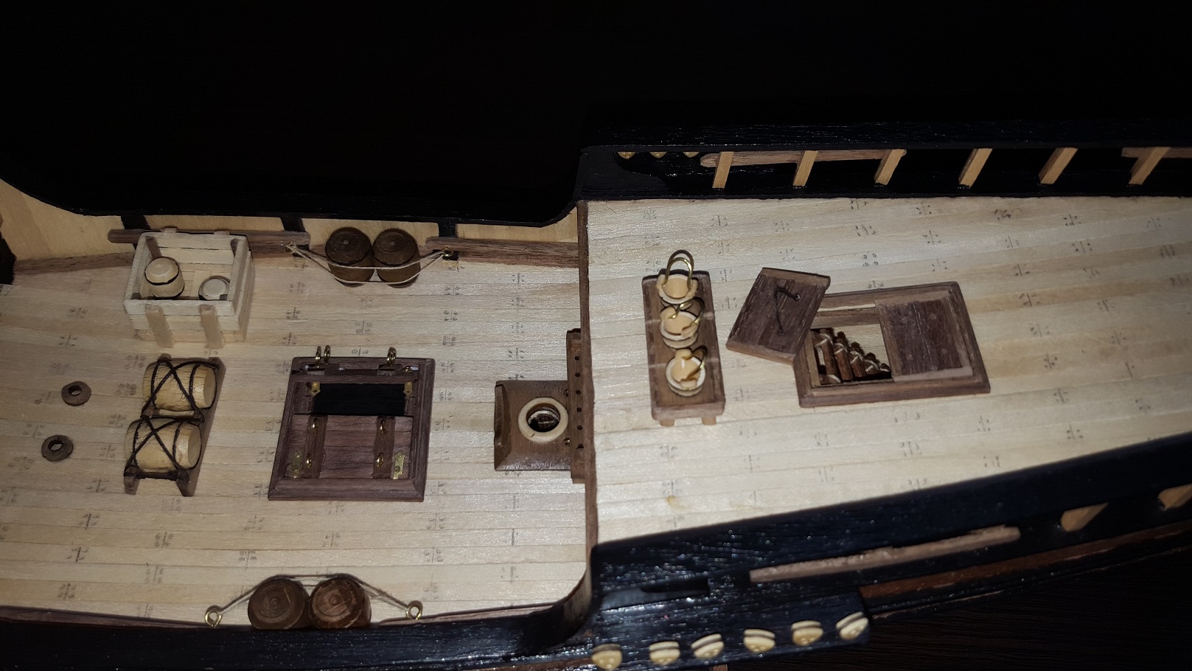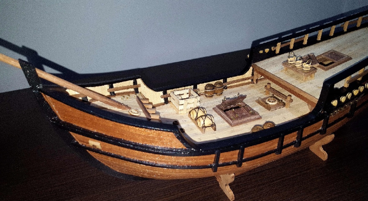 Poniżej kilka zdjęć stanu obecnego, została mi do złożenia winda kotwiczna, kotwice i 1 poręcz bym mógł zabrać się za maszty linki i supełki węzełki