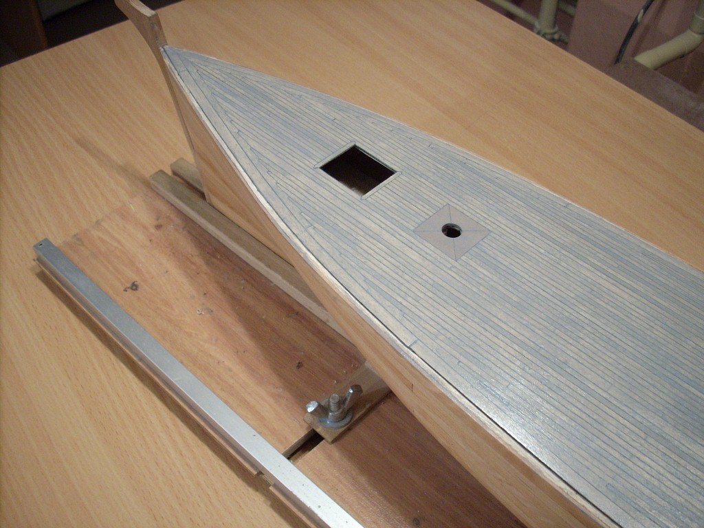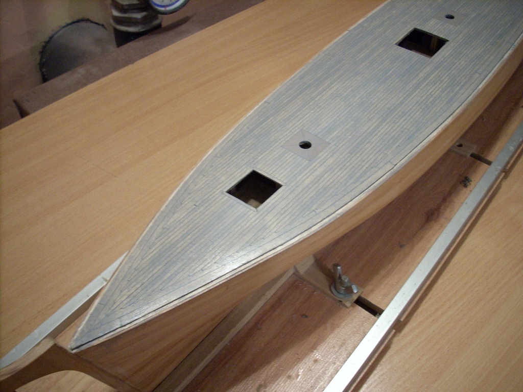 Położyłem pierwszy fragment pokładu. Deski to brzoza a uszczelnienie wklejony czarny papier . Po wielu próbach z bejcami impregnatami i innymi mazidłamy w końcu uzyskałem kolor jaki mniej więcej chciałem jest to mieszanka impregnatu do drewna Altax kolor biały i heban, więcej białego z odrobiną hebanu dało mi to szary kolor . Zdjęcie nie pokazuje dokładnie koloru uzyskanego ale jest zbliżone i wygląda bardzo fajnie