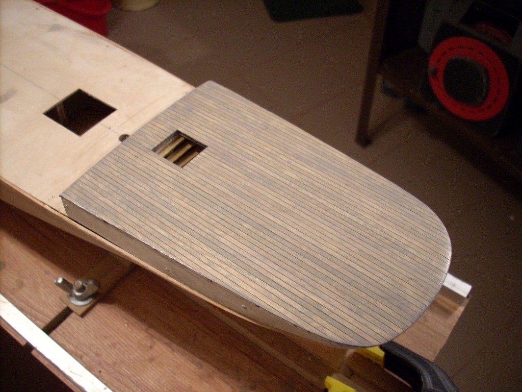Położyłem pierwszy fragment pokładu. Deski to brzoza a uszczelnienie wklejony czarny papier . Po wielu próbach z bejcami impregnatami i innymi mazidłamy w końcu uzyskałem kolor jaki mniej więcej chciałem jest to mieszanka impregnatu do drewna Altax kolor biały i heban, więcej białego z odrobiną hebanu dało mi to szary kolor . Zdjęcie nie pokazuje dokładnie koloru uzyskanego ale jest zbliżone i wygląda bardzo fajnie