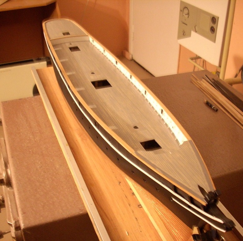 Ja swój kadłub obiłem jednak miedzią bo mnie stać na miedź a co :D a tak po prawdzie to o wiele łatwiej i wygodniej jest zrobić to taśmą samoprzylepną miedzianą a takie można dostać bardzo łatwo niż kleić blaszki mosiężne a po drugie o wiele bardziej mi się podoba taki pokryty miedzią niż taki właśnie jasny mosiężny bo biorąc skład chemiczny to musiałby on mieć 60%miedzi i 40% cynku no i w zasadzie tak najczęściej mosiądz ma plus jakieś małe dodatki innych metali i jest wtedy wiele jaśniejszy od miedzi więc to jest kwestia podejścia a jak się pokryje patyną za kilka lat to i nie będzie widać specjalnie różnicy . Gwoździowanie robię za pomocą igły lekarskiej wyciskając na blaszkach odpowiednią imitacje