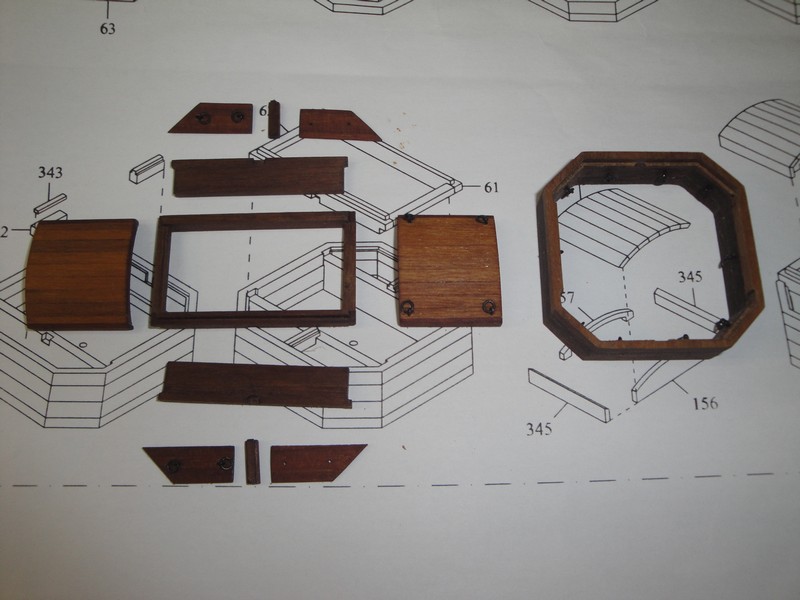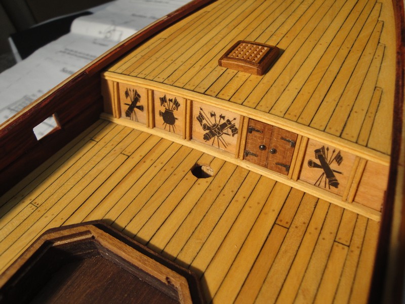 Skonczylem kosz dziobowy w wersji zestawowej. Przymierzylem sie do nowych lawet (dzieki Mirku) i stwierdzilem ze sa ewidentnie duzo lepsze od tych z zestawu. Skompletowalem rufe uzywajac dostarczonych elementow zdobniczych. Zdecydowalem sie na kolor przypominajacy drewno, bo te pstre kolorki mi nie odpowiadaja. Przy okazji stwierdzilem, ze producent strzelil kaszane, i w zestawie dostarczyl dwa identyczne elementy zdobnicze, a powinno byc odbicie lustrzane (lewa i prawa strona). Wyslalem maila, zobaczymy jak szybko zareaguje (i czy zareaguje :) ). Przybyl tez ster i rufa jest kompletna. Dopiero na zdjeciu zauwazylem, ze jeden z zawiasow klap dzialowych na burcie sie odkleil, trzeba bedzie go odnowic.