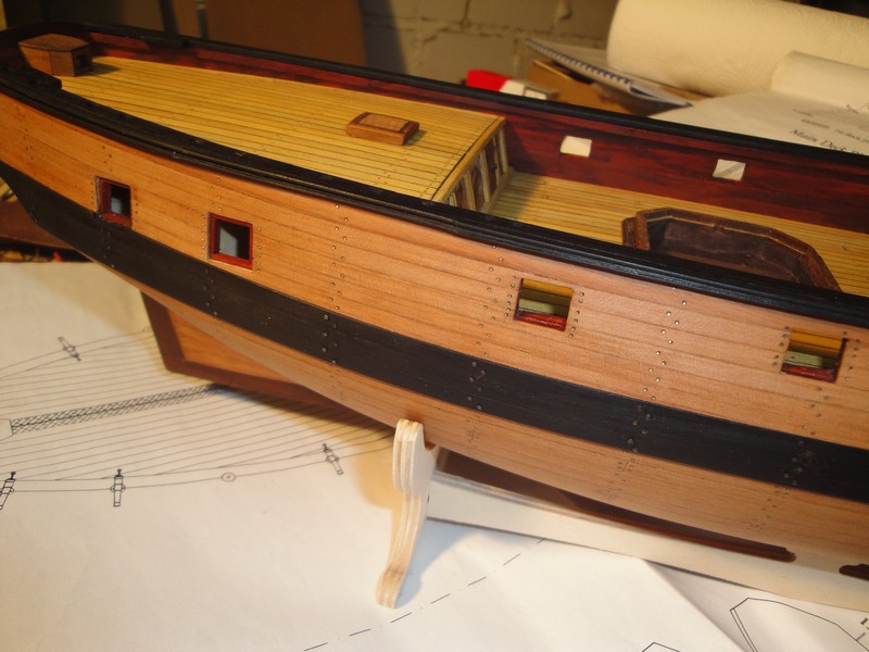 oczywiscie Mati masz swieta racje, na kazda wrege przychodzil rzad gwozdzi, dziekuje za konstruktywna krytyke, ale: ja nie poszedlem na latwizne, swiadomie dalem tyle ile jest. Model jest w skali 1:64 co rezultuje w dlugosci kadluba ok. 50cm. Przy ca. 50 wreg, daje to jeden rzad gwozdzi obok drugiego. W konstrukcji kadluba w zestawie bylo 9 pseudo wreg. Poszedlem na kompromis i dalem gwozdzie co trzecia wrege: w sumie 16 rzedow. Tak mi to optycznie odpowiada i niech tak to juz zostanie, pomimo ze nie jest to zgodne z historyczna rzeczywistoscia.