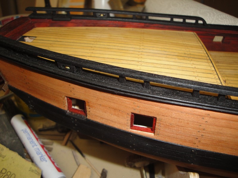 Pociagnalem kadlub olejem lnianym i od razu nabral cieplego koloru. Przymiezylem sie do mozdzieza. Nie jestem 100%owo pewny, czy te uchwyty przy lawecie mozdzieza nie sa za cienkie? Co o tym sadzicie? Zalozylem porecze (?) na burty no i w koncu zagwozdziowalem odbojnice.