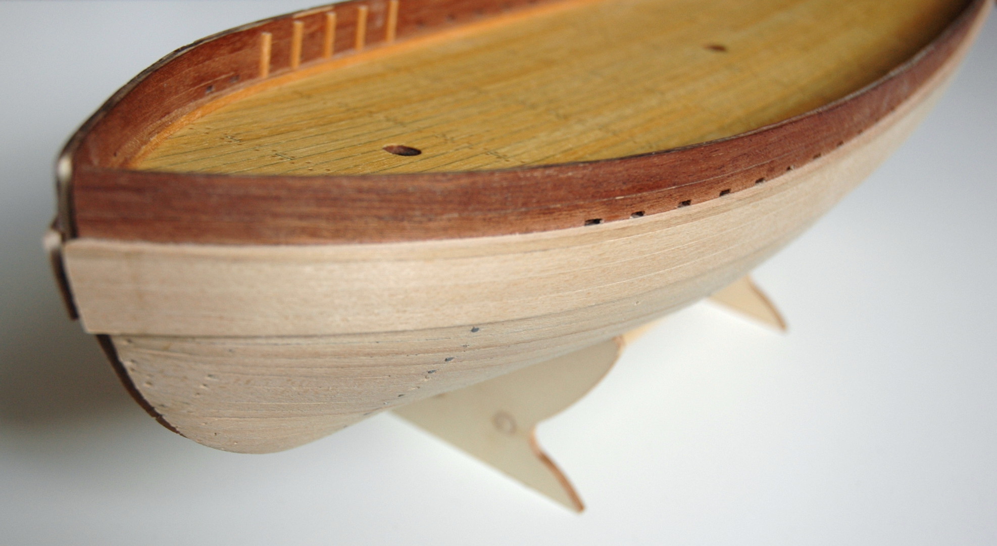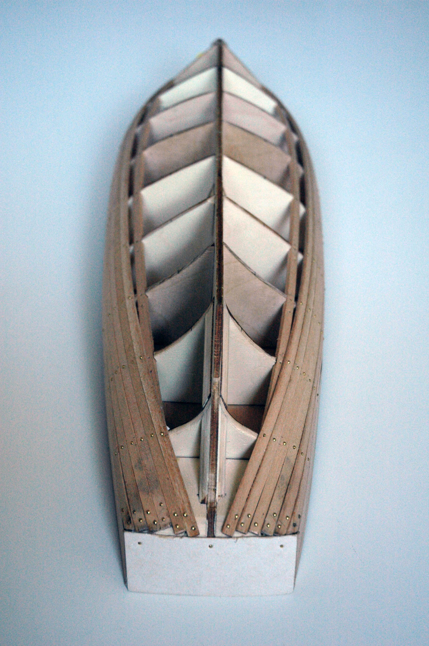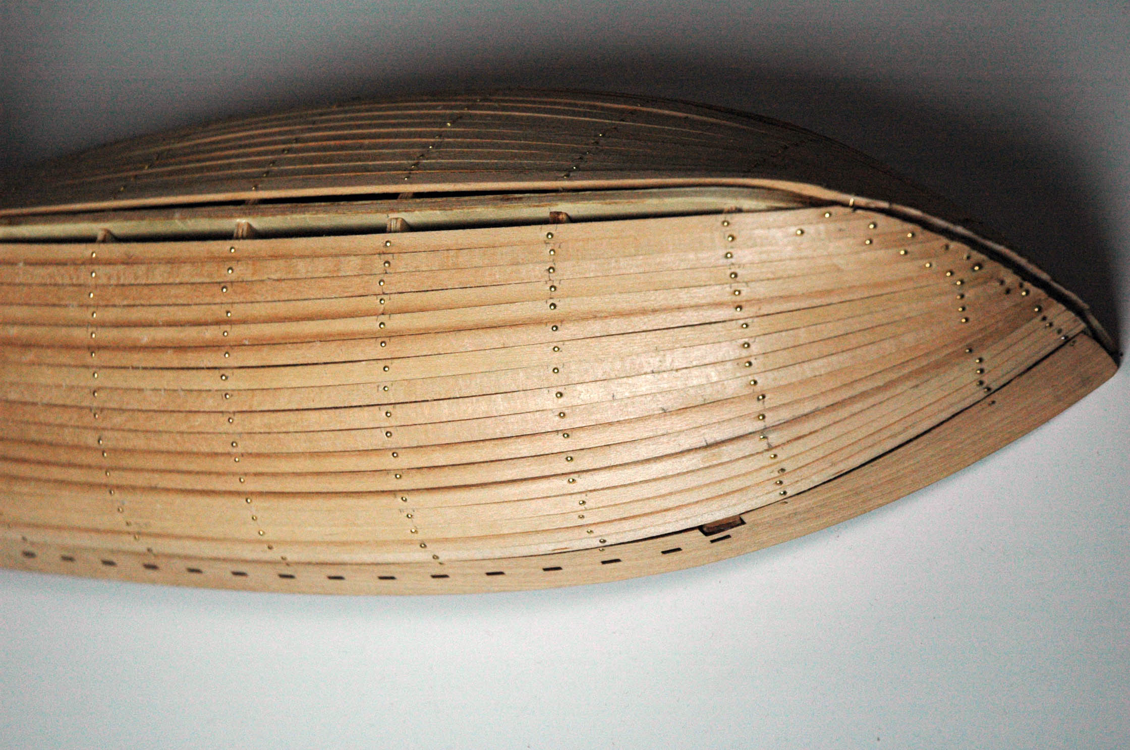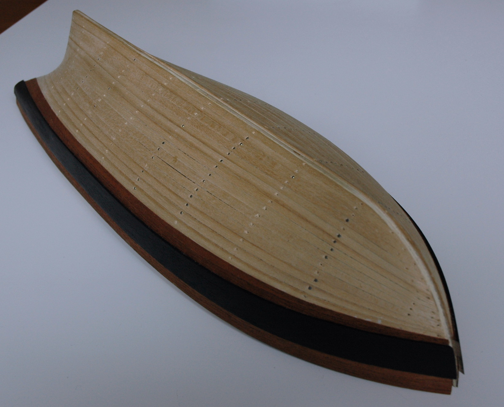 Udało mi się skończyć pierwszą warstwę deskowania. Teraz będę szlifował kadłub i dopsaowywał szczelinę do zamocowania kilu.