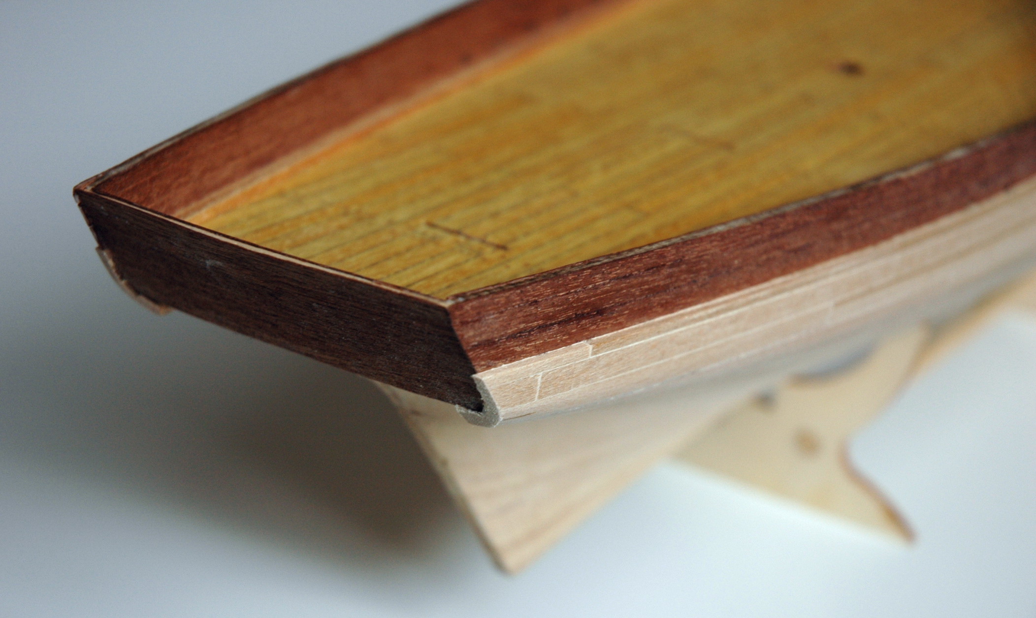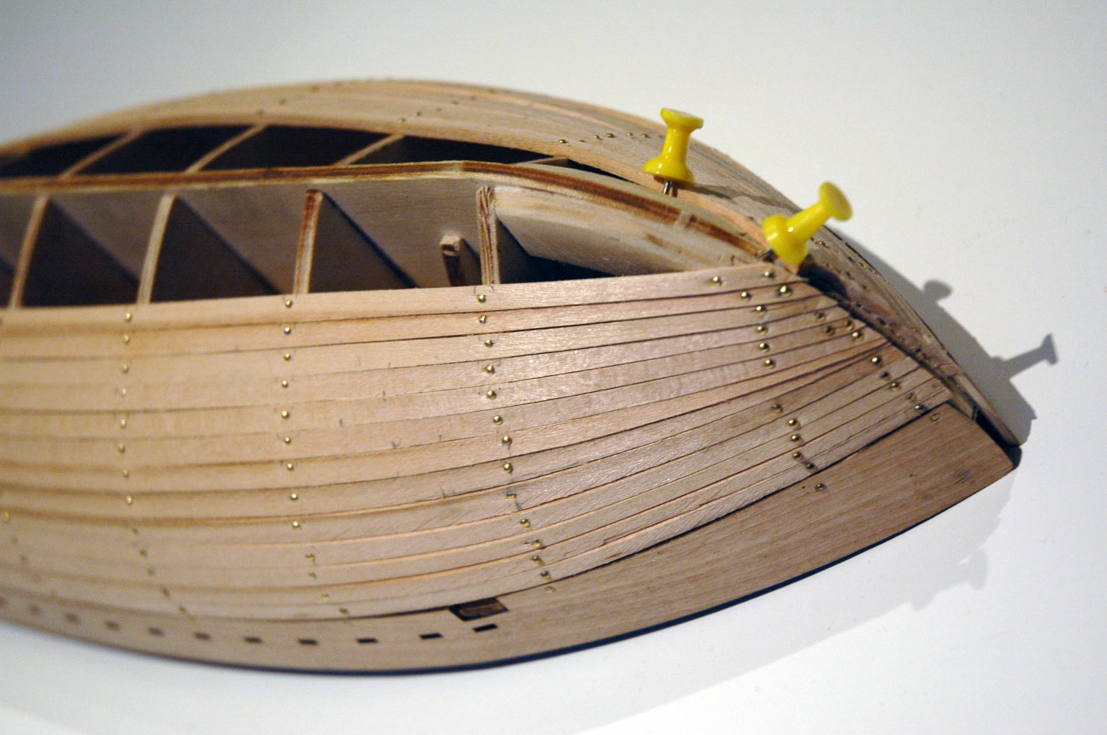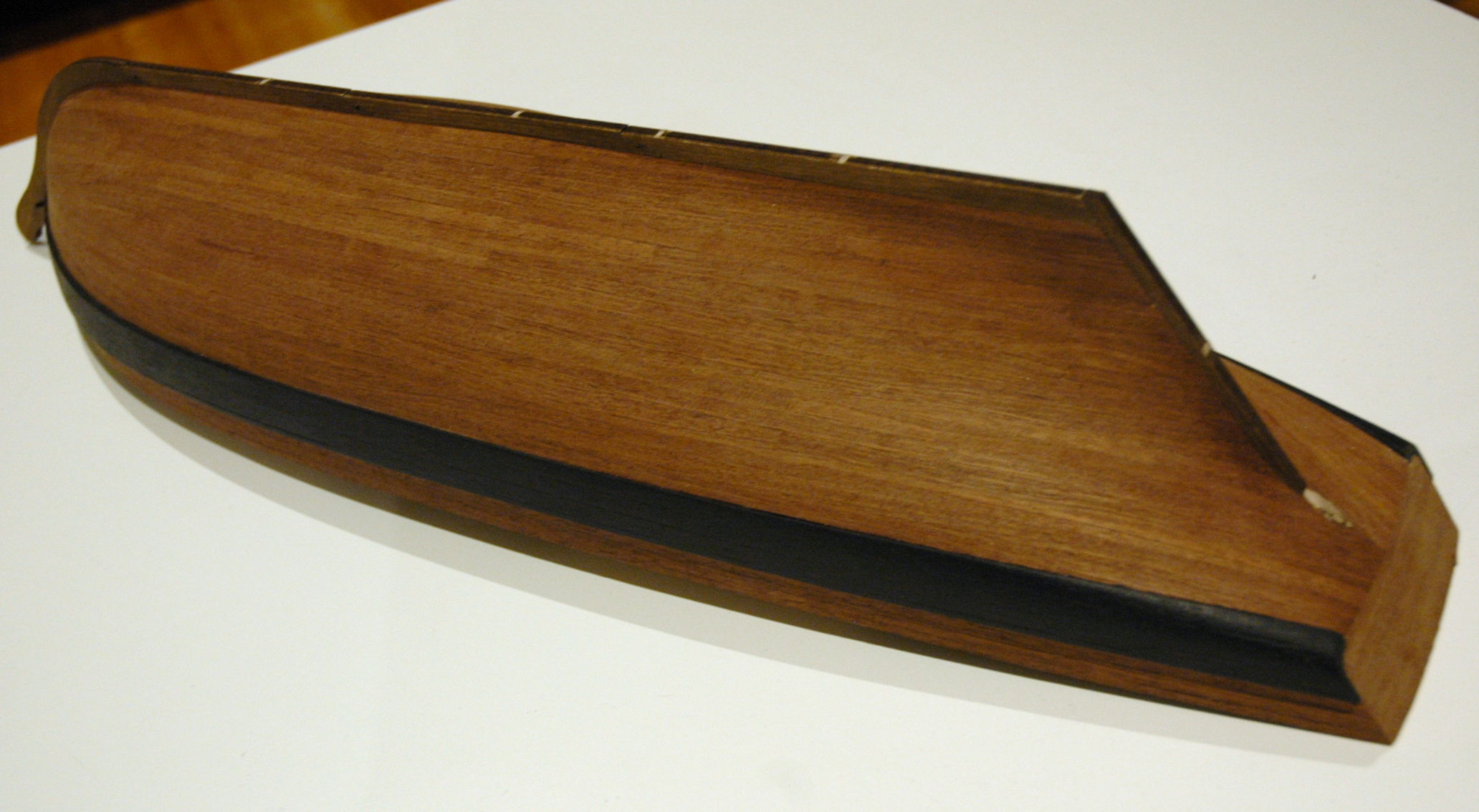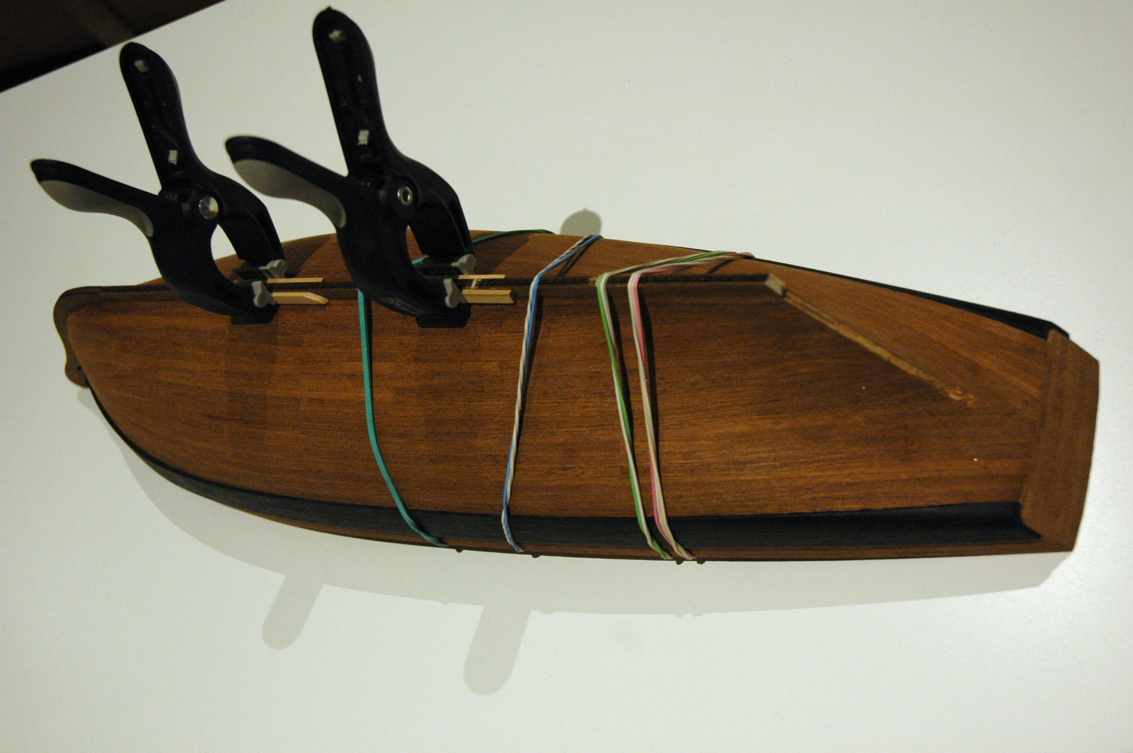 Udało mi się skończyć pierwszą warstwę deskowania. Teraz będę szlifował kadłub i dopsaowywał szczelinę do zamocowania kilu.