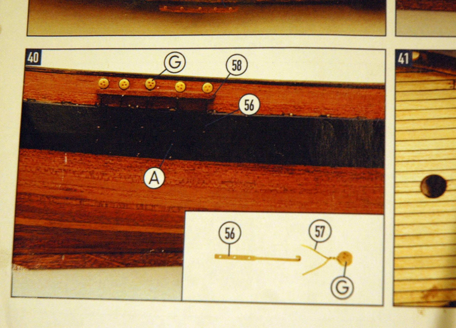 Ad. 2 - Ja bym to zrobił w ten sposób: Włóż między te "wąsy" od obejmy jufersa - element 57 na Twym skanie, wiertełko o grubości takiej samej jak ten "haczyk" - element 56, po czym dwukrotnie okręć ciasno owe wąsy na tym wiertle - uzyskasz oczko w które włóż ten haczyk a resztę drutu od skrętów odetnij. Z tyłu za tym haczykiem będzie niewidoczny krótki odcinek skręconych wąsów, które dla wzmocnienia całosci zlutowałbym razem z haczykiem, po czym poczerniłbym całość chemicznie czernidłem. Zamontowałbym tymczasowo klejem CA tak uzyskany element w wycięciu (ząbku) ławy talrepowej. Na końcu, gdy już są tam wszystkie jufersy z odciągami, przykleiłbym na tej krawędzi ławy cieniutką listeweczkę, przykrywając nią wycięcia w ławie w których tkwią te skręty odciagów jufersów.