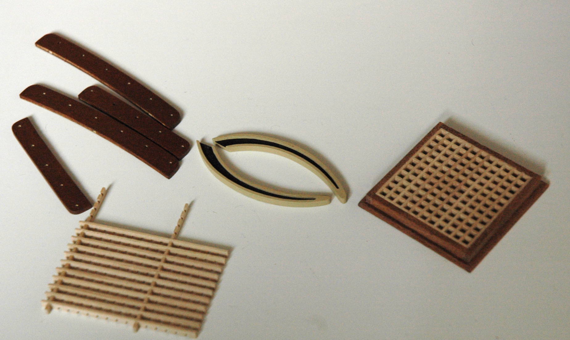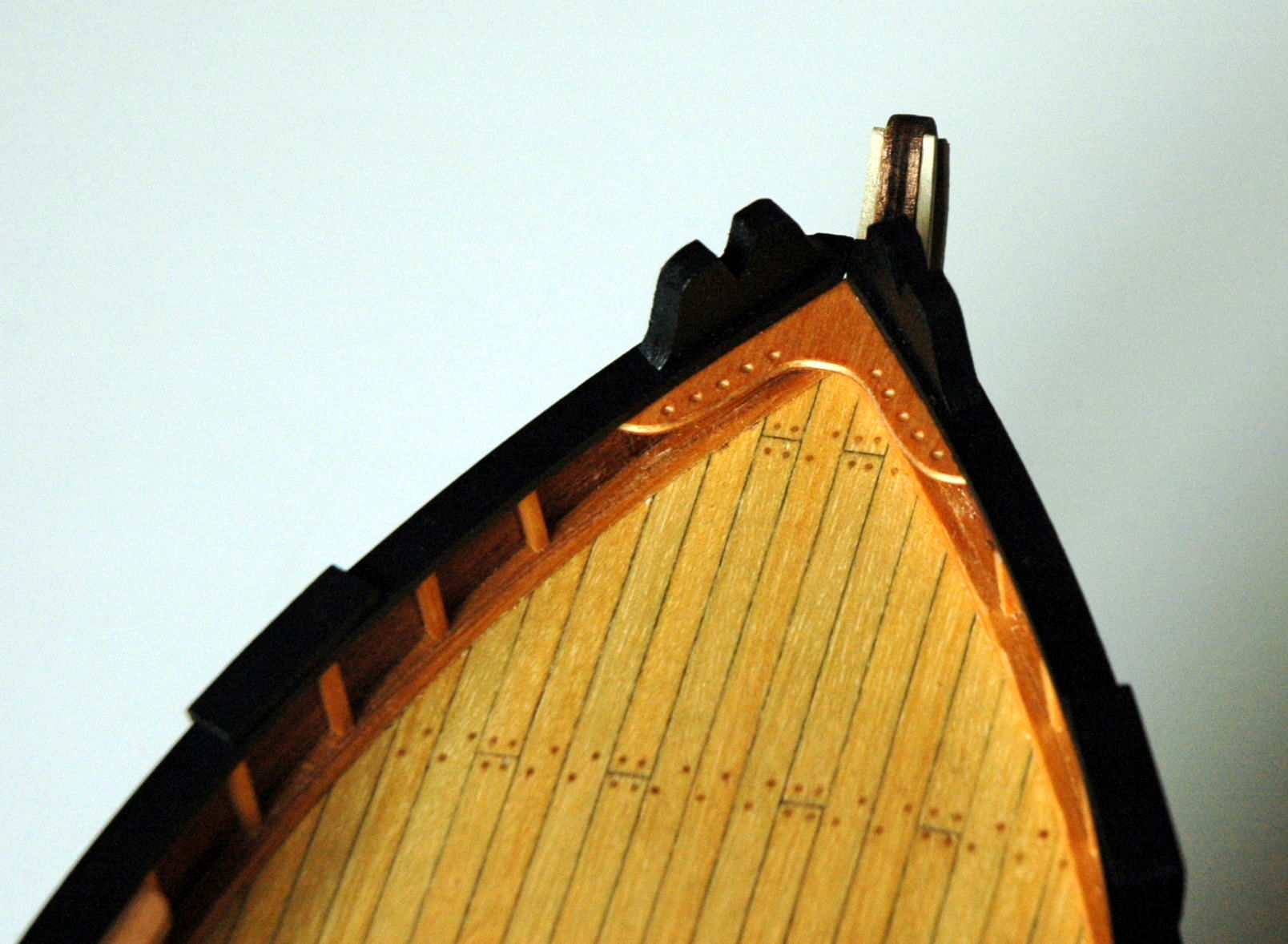 Ad. 1 - Jeśli zdążasz do wierności z oryginalnymi praktykami szkutniczymi (ale chyba niekoniecznie, bo wtedy nie poszywałbys kadłuba podwójnie), to okucia steru powinny być raczej czarne, zmienione czasem i wodą, ale w sumie to jest tylko model i Ty jesteś jego budowniczym, więc decyzja należy do Ciebie.