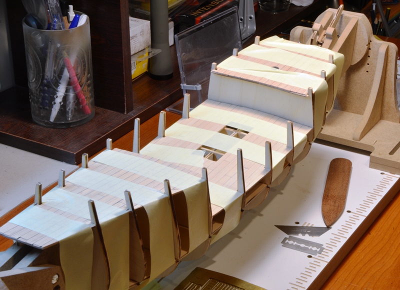 Według niektórych teorii poszywanie rozpocząłem od stępki. Teraz nie mam pewności czy warto. Może od góry do stępki byłoby wygodniej ?