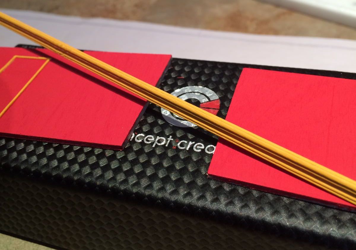 Po wycięciu odpowiednich listew z olchy 1,3 x 4,8 mm musiałem je zeszlifować z szerokości, ponieważ deski muszą być zbieżne.