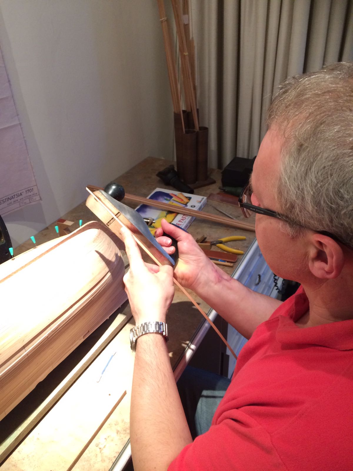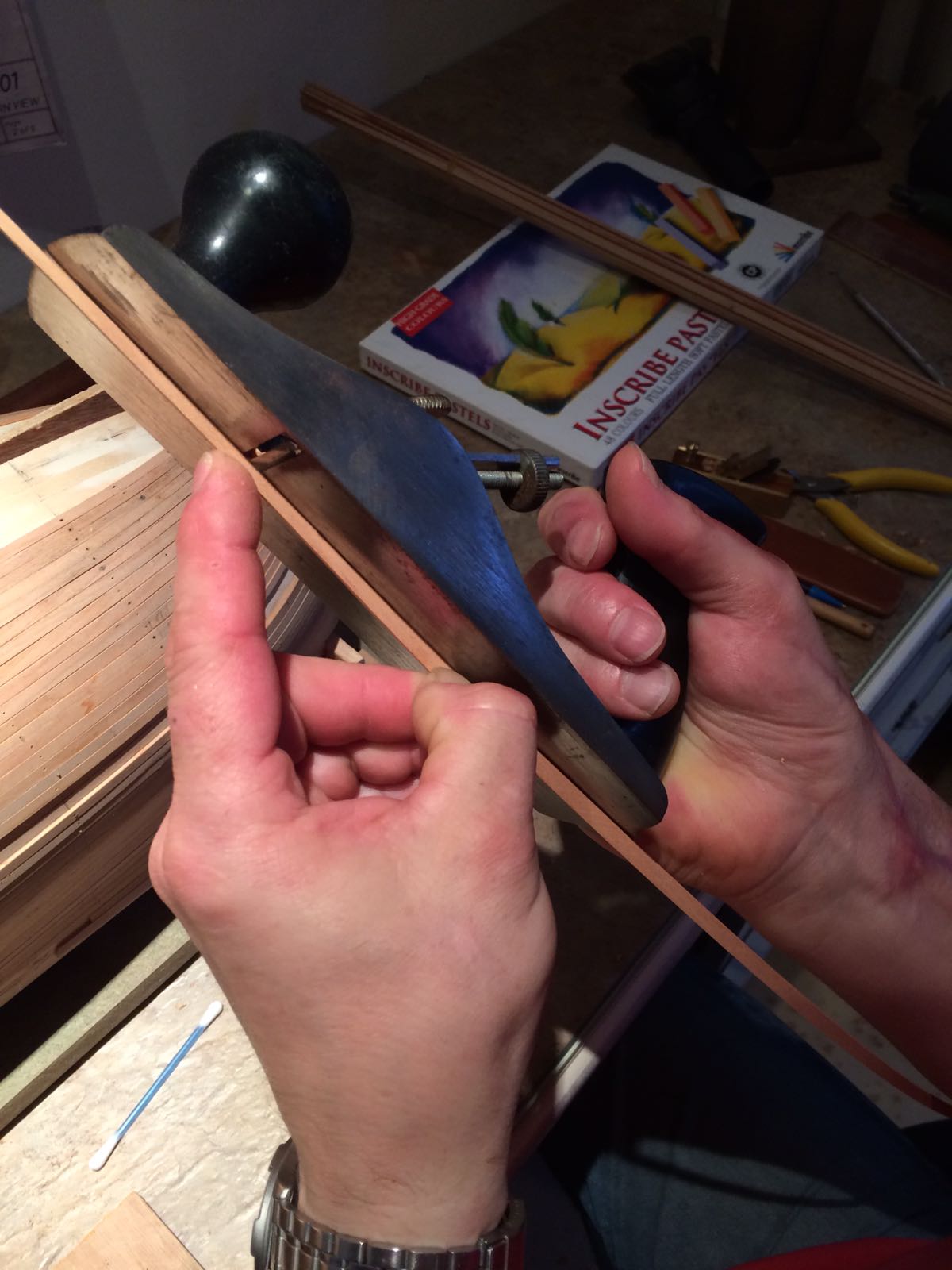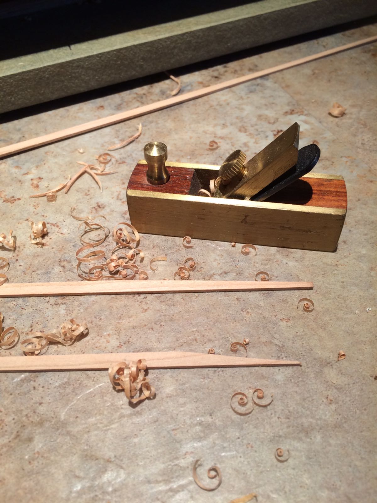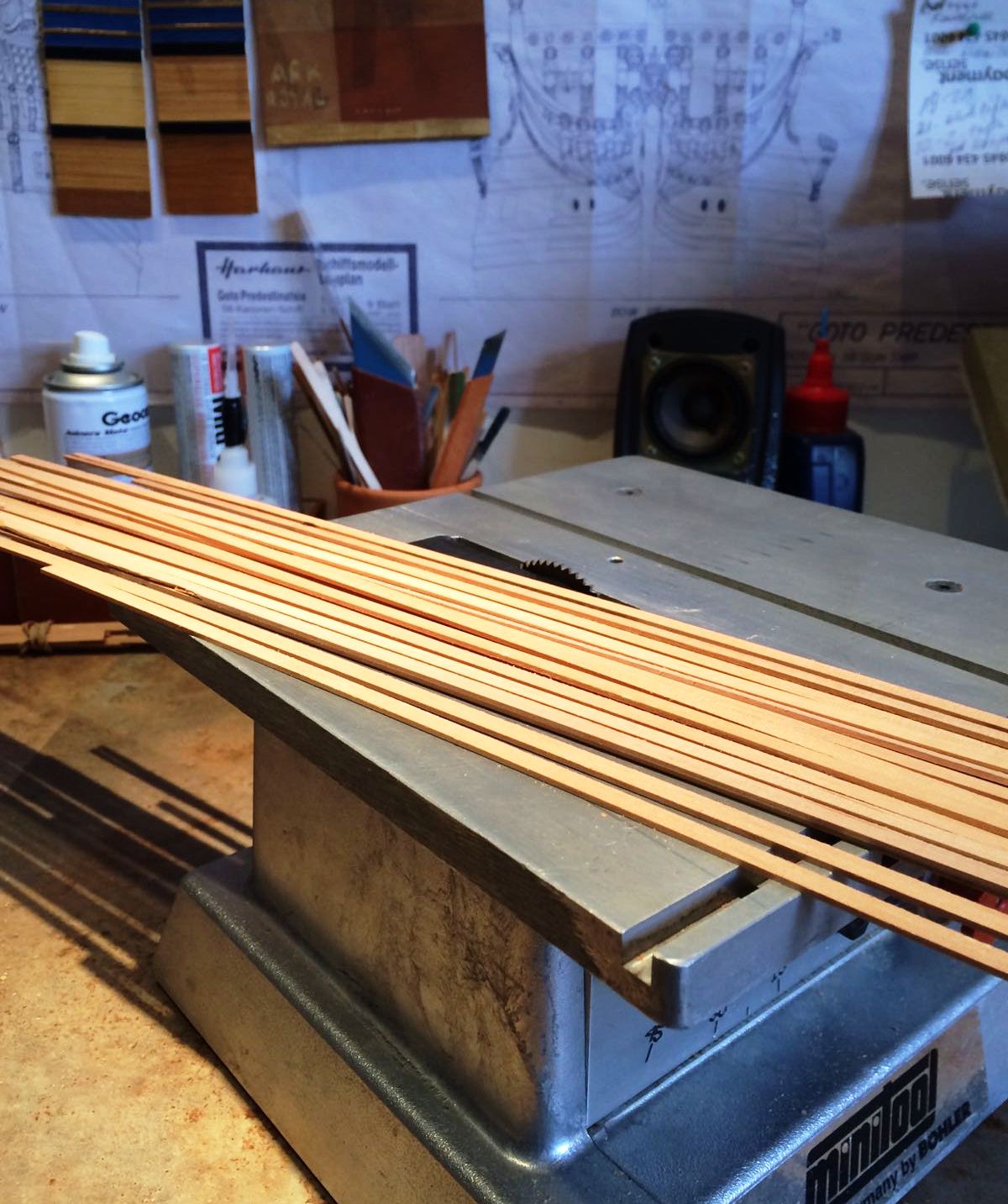 Po wycięciu odpowiednich listew z olchy 1,3 x 4,8 mm musiałem je zeszlifować z szerokości, ponieważ deski muszą być zbieżne.