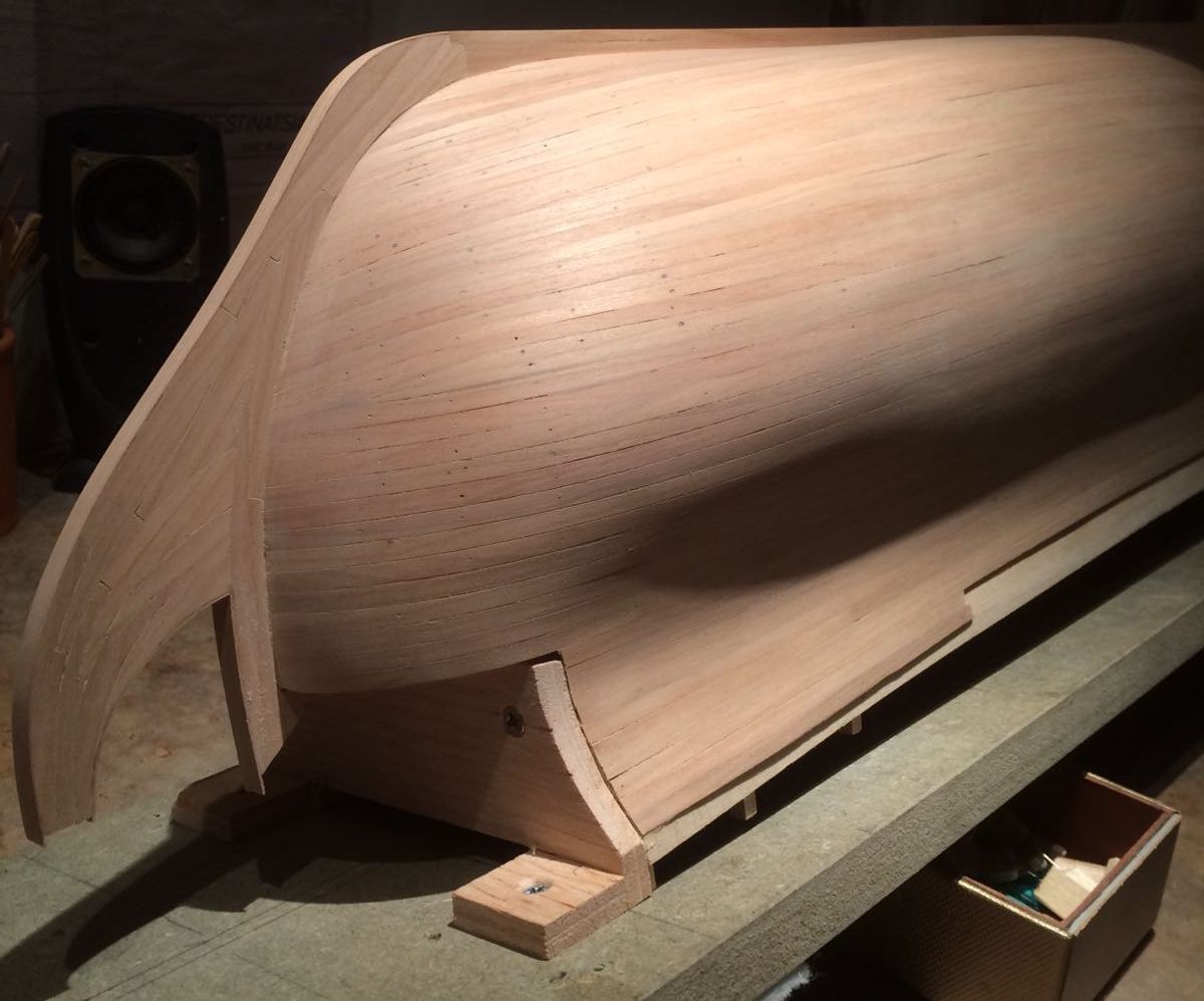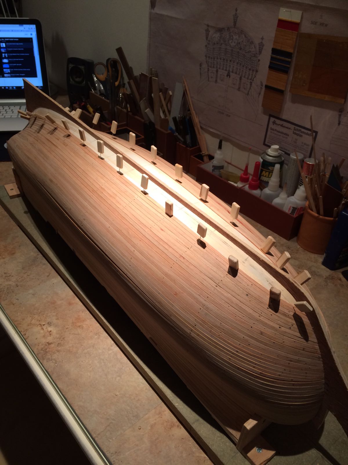 Mając Plany Modelarskie nr 145 z 1988r. planowałem, że kiedyś zbuduję ten żaglowiec. Po ich przeanalizowaniu doszedłem do wniosku, że mnie jednak nie zadowalają (brak szczegółów). Zakupiłem plany z wyd. Harhaus. W trakcie budowy będę opierał się właśnie na nich oraz na znalezionych w sieci zdjęciach repliki Goto zbudowanej w 2014r. w Woroneżu. Myślę, że projekt zajmie mi 2-3 lata. Drewno użyte do budowy to olcha (pokłady i maszty) oraz czereśnia - ze względu na jej piękny kolor. Szkielet buduję metodą tradycyjną: wręgi ze sklejki 5 mm, usztywniane kołkami drewnianymi fi 15 mm. Poszycie podwójne z listewek. Do wycięcia posłużyła mi wyżynarka i stolik własnej roboty. Po sklejeniu szkieletu zabrałem się do klejenia pierwszego poszycia z lipy 7x1,5mm.