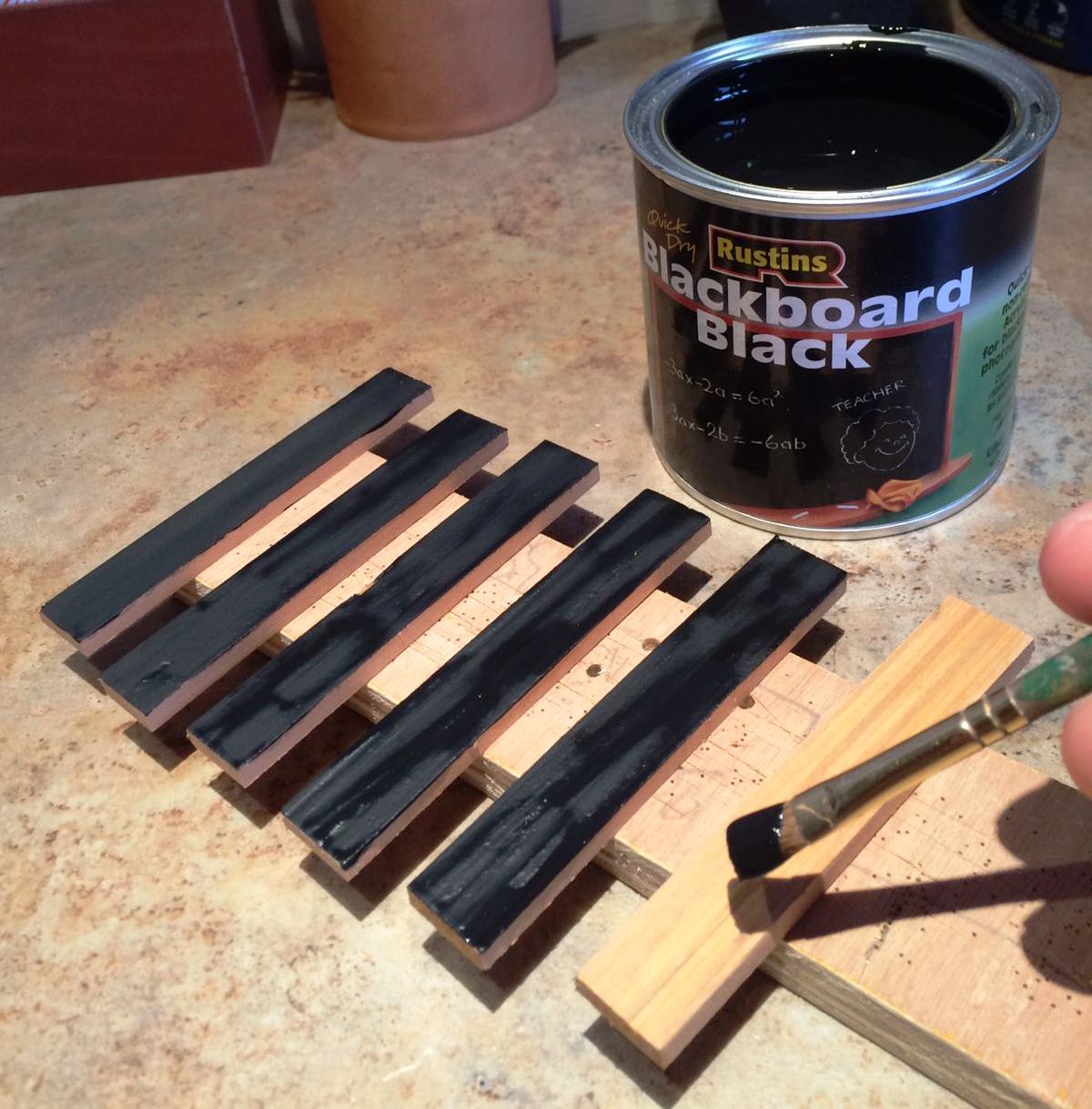 Następnie, pocięte na odpowiednie długości, sklejam w pakiety i maluję czarną farbą akrylową, uprzednio gruntując rozcieńczonym wikolem.