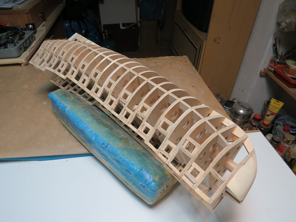 Ryszard,wszystko dzięki 3 punktom orientacyjnym zaznaczonych na wręgach,linii wodnej oraz stępki.Najpierw nasadziłem na wałek wręgę środkową sprawdzając kąty proste.Po zaschnięciu kleju za pomocą tego szablonu doklejałem kolejne wręgi z jednej i z drugiej strony sprawdzając najlepszym przyrządem czyli na oko,