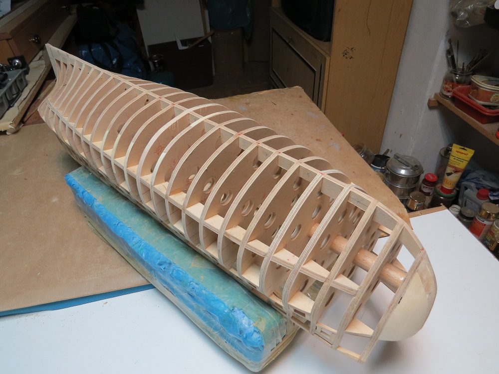 Oczywiście po dokładnym trasowaniu nie obyło się bez drobnych poprawek.Szczególnie podczas szlifowania wręg i ustawianiu otworów pod furty.Szkielet jest symetryczny i nie zwichrowany.Szczelina pod kilem oraz pod dziobnicą jest zachowana tak,że 1/3 planki się chowa.
