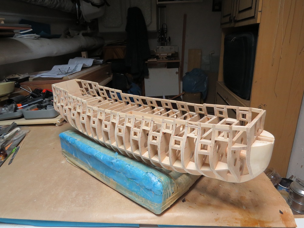 Miałem problem jak rozwiązać w prosty sposób galerię rufową a ponieważ okna i tak będą matowe,wymyśliłem taką oto konstrukcję.Jest trochę toporna,ale wszystko będzie pokryte gzymsami,zdobieniami itp.Tak,że wszystko się schowa.Najgłówniejsze prace przy szkielecie są zrobione.Teraz tylko przemyśleć plan dalszych prac,aby było jak najmniej poprawek.Pozdrawiam.K.