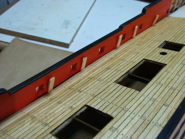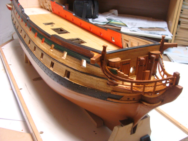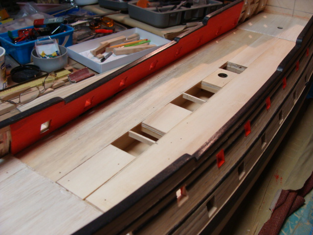 Papierowe przymiarki.Pokład klejony na cienkim bristolu.Boczne krawędzie będą doklejone na końcu.Listwy waterwaya zamaskują styk z nadburciem.Praktycznie to ten pokład będzie mało widoczny w przeciwieństwie do pokładów górnych.Niemniej kołkowanie jakieś trzeba zrobić.Przynajmniej tam gdzie będzie widać.Pozdrawiam.K.