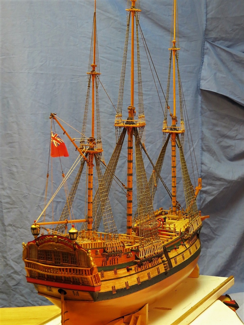 Bukszpryt uzbrojony.Pewne rzeczy pominąłem(górna rejka)I tak jest sporo olinowania a jeszcze dojdą bloczki i wiązania sztaksli tak,że nie chciałbym stracić na przejrzystości.
