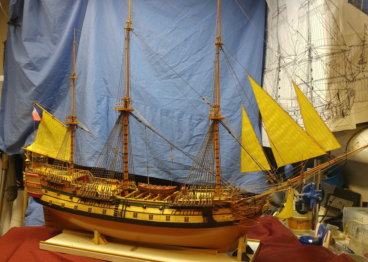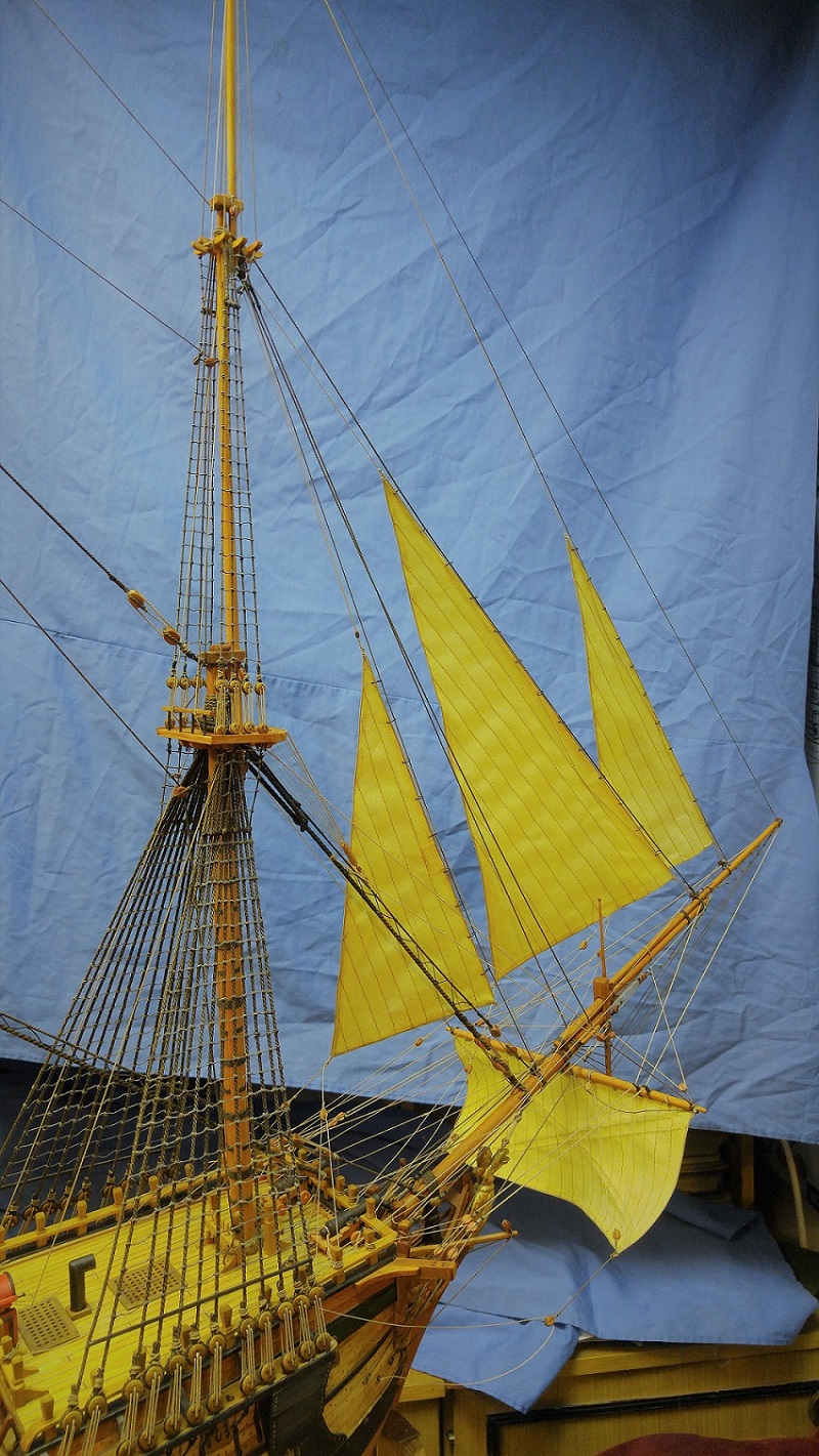 Na zdjęciach kolor pokładów niewiele się różni od koloru żagli ale to wina oświetlenia jarzeniowego.W rzeczywistości żagle są koloru lekko żółtego a pokłady szaro-żółte.Nie chciałem białych żagli a te w/g mnie nawet się nieżle prezentują.Pozdrawiam.K.