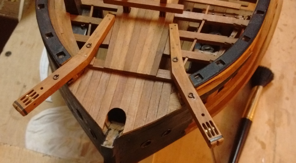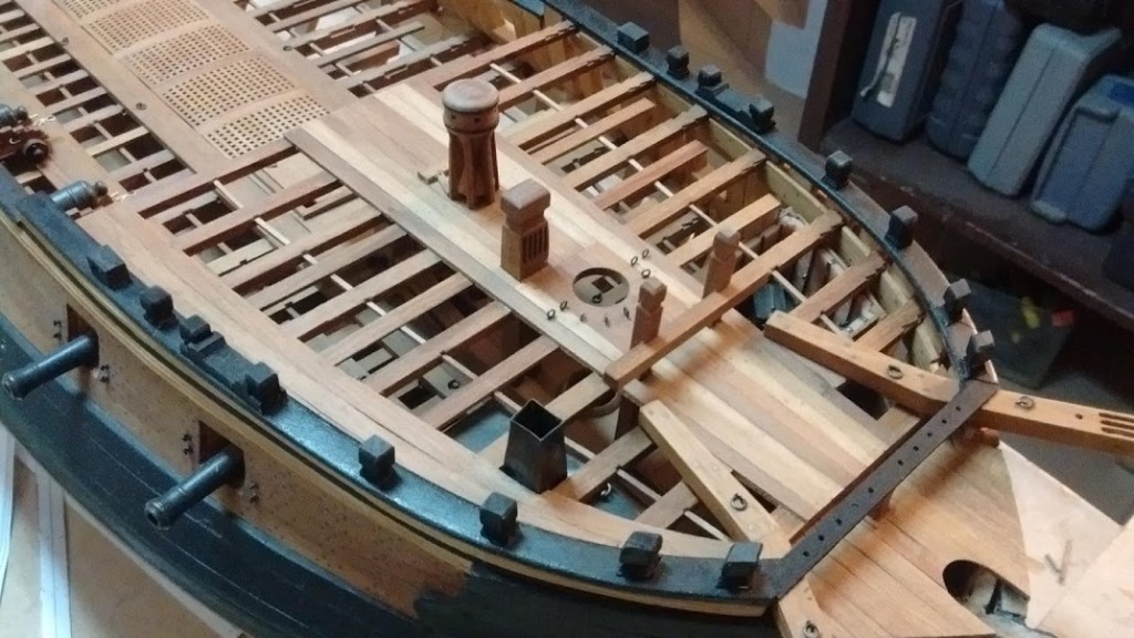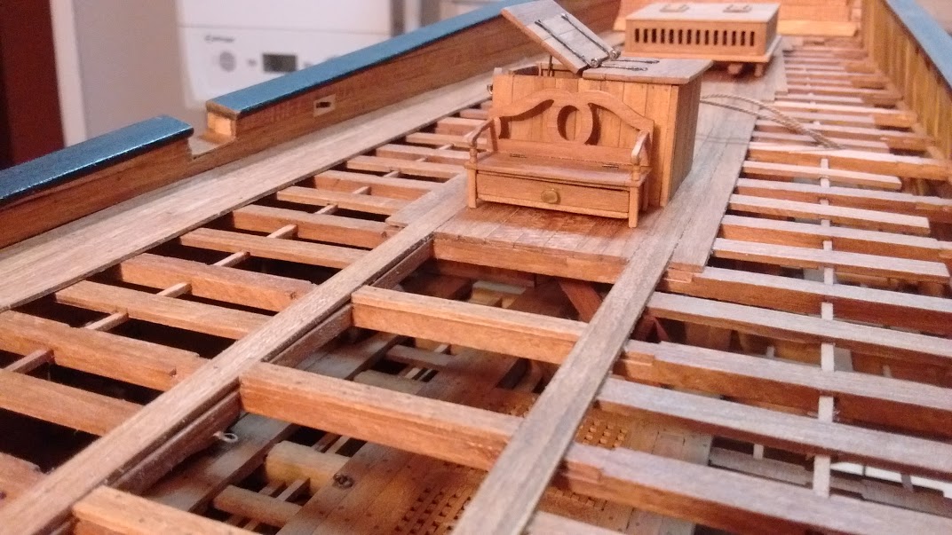 Może tylko dałbyś krótkie odcinki planek pokładowych pod koła lawet, by na nich poustawiać działa - to powinno wystarczyć i dac wystarczający efekt ażurowości, by pod nimi niższe pokłady były jeszcze widoczne.