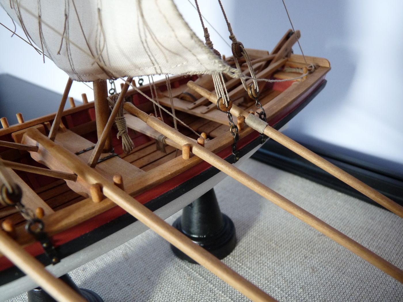 Do przytrzymania rei do masztu użyłem takiego rozwiązania jak widać na zdjęciach ( kausza przymocowana do fału ). Bardzo podobne rozwiązanie było na jednostkach brytyjskich po około 1775 roku.