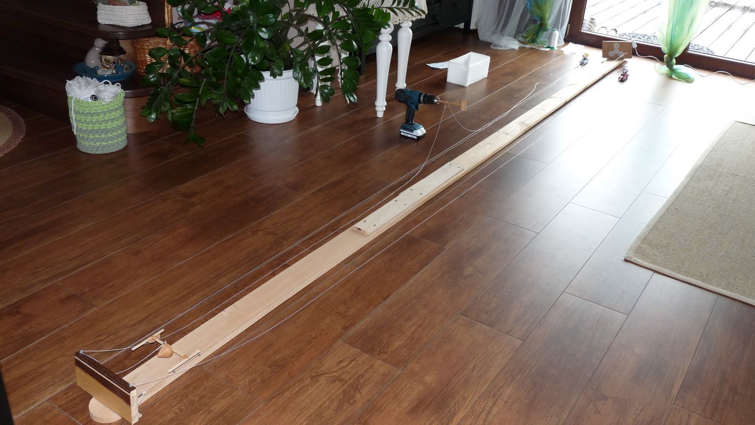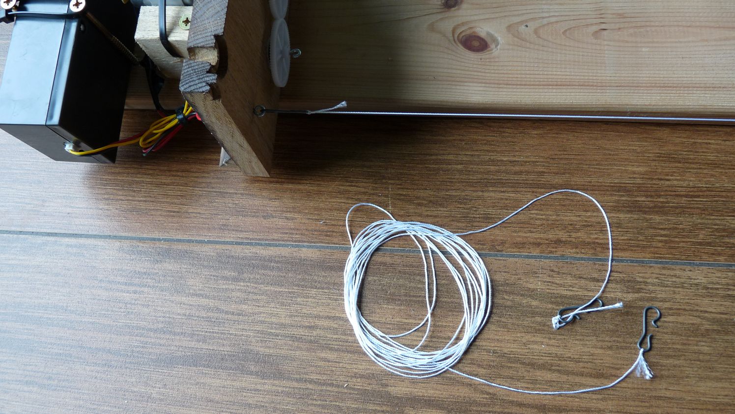 Sznurek z krętlikiem ze sklepu wędkarskiego posłuży do naprężenia liny, którą będziemy skręcać, montujemy tak jak na zdjęciach.