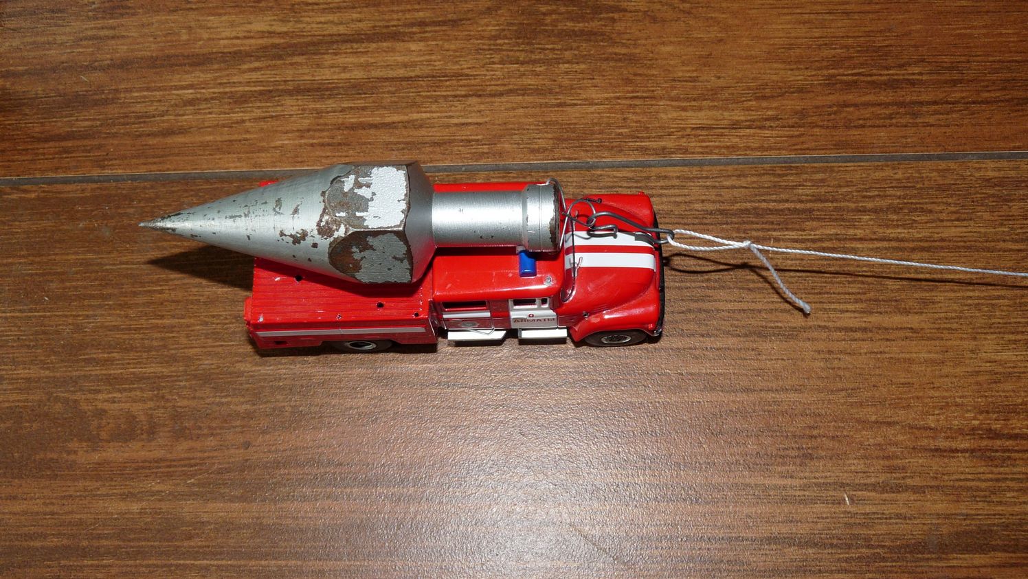 Włączamy urządzenie i podziwiamy magię skręcania naszej liny. Niebieski samochód jedzie i pilnuje wrzeciona a czerwony naciąga skręcaną linę, która kurczy się o około 1/3. Całe urządzenie ma 4.5 m i można skręcać liny od 2.6 m. do 3.0 m. w zależności od rodzaju i grubości nici jakiej użyjemy.