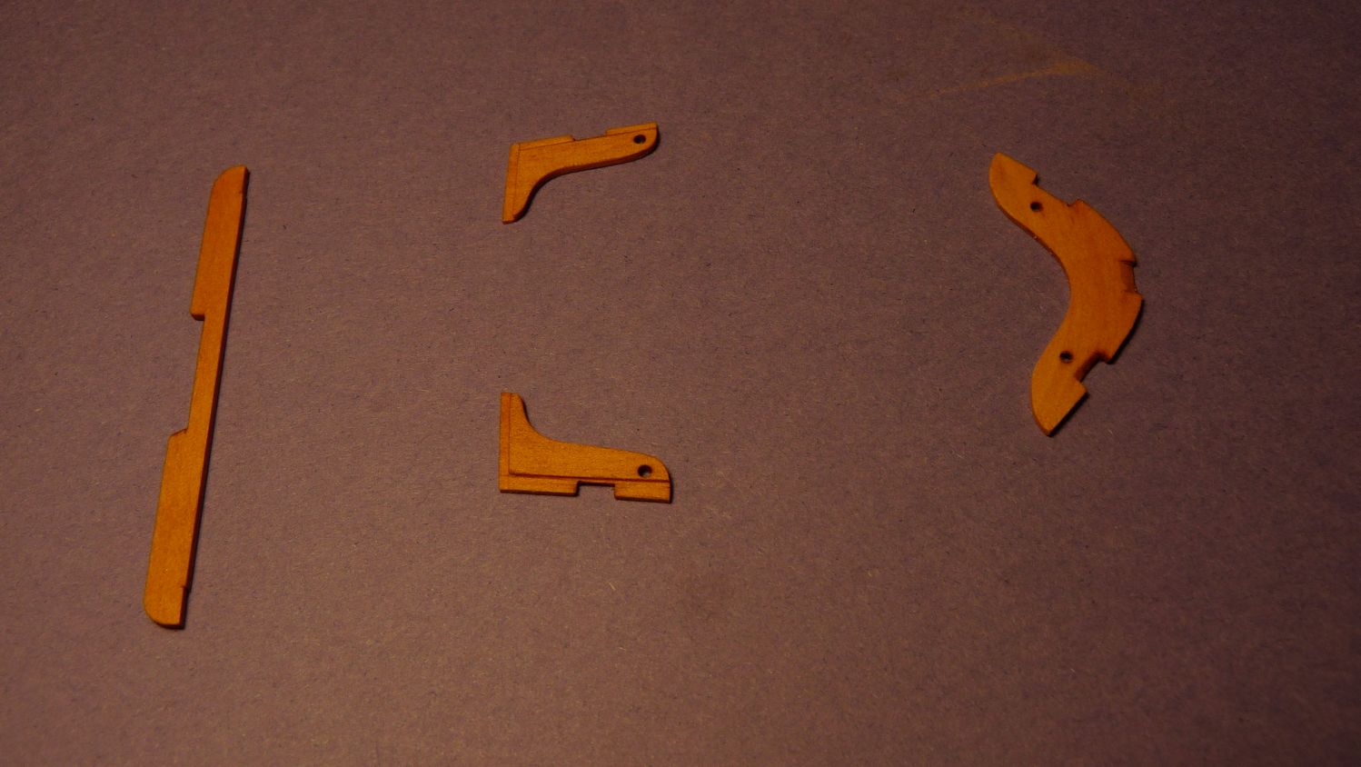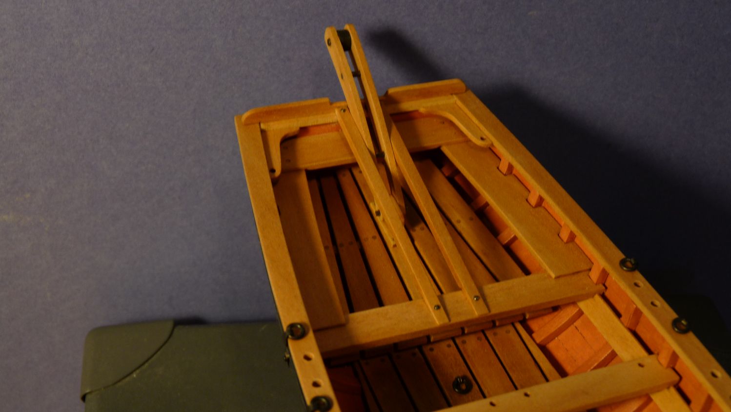 Kolejne elementy to kołki do obracania kabestanu i kołowrotów oraz podstawka pod szalupę.