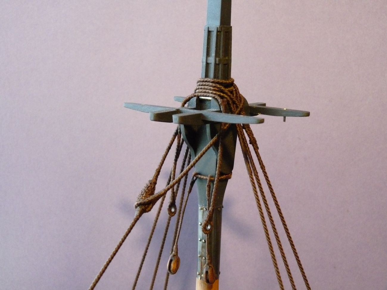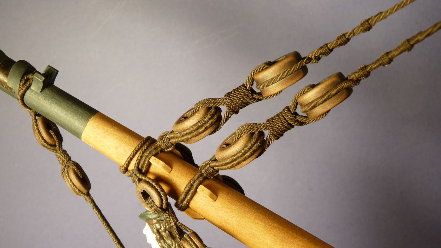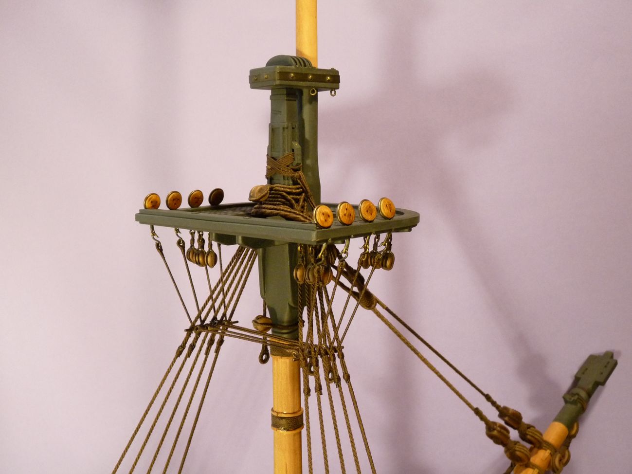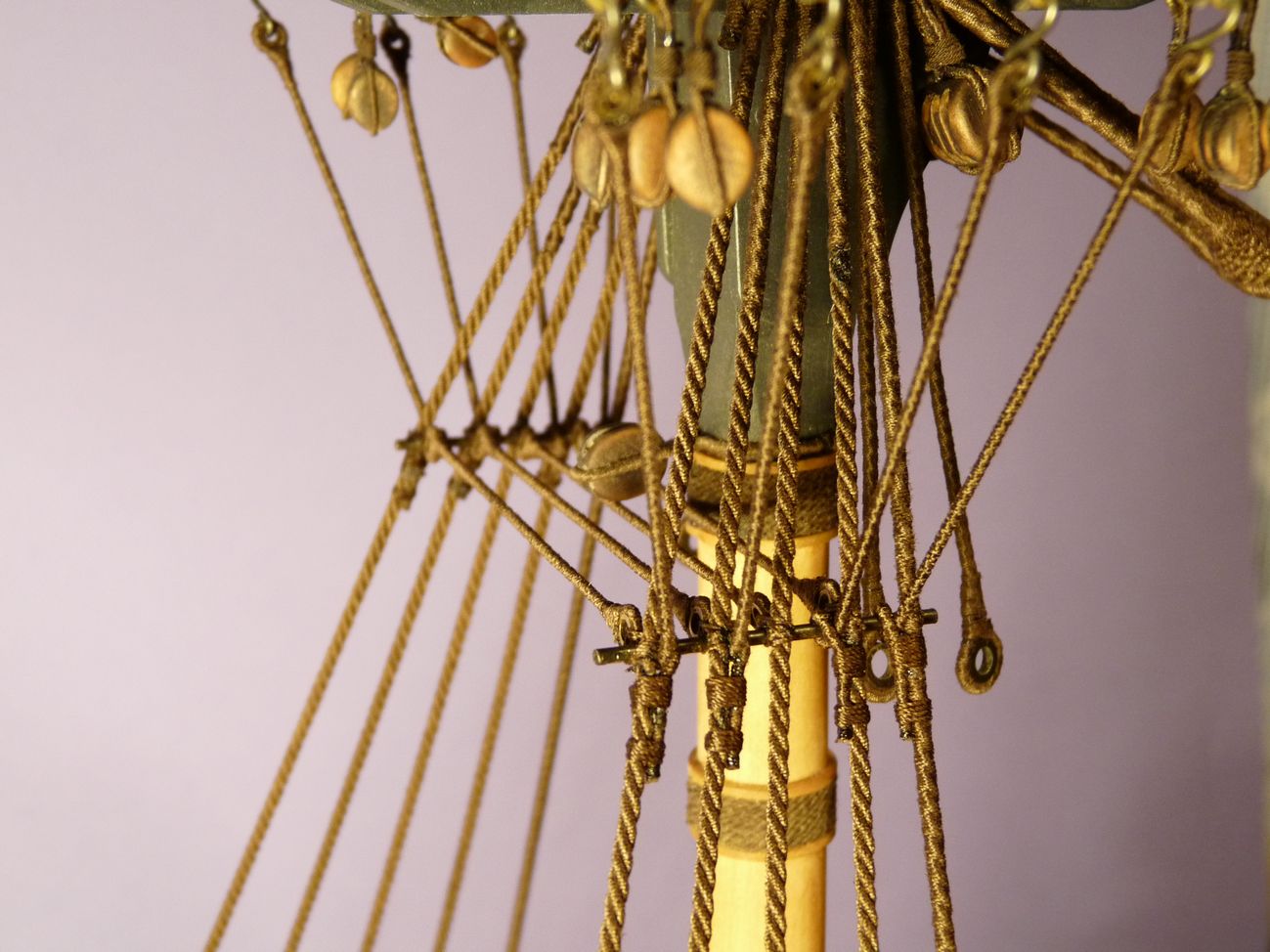 Kolor poszczegolnych linek olinowania zalezny jest od Ciebie - to Twoj model, pamietaj jednak, ze tak wanty jak i wyblinki nalezaly do olinowania stalego - czyli kolor ciemny (prawie czarny) - tzw. smola sztokholmska.