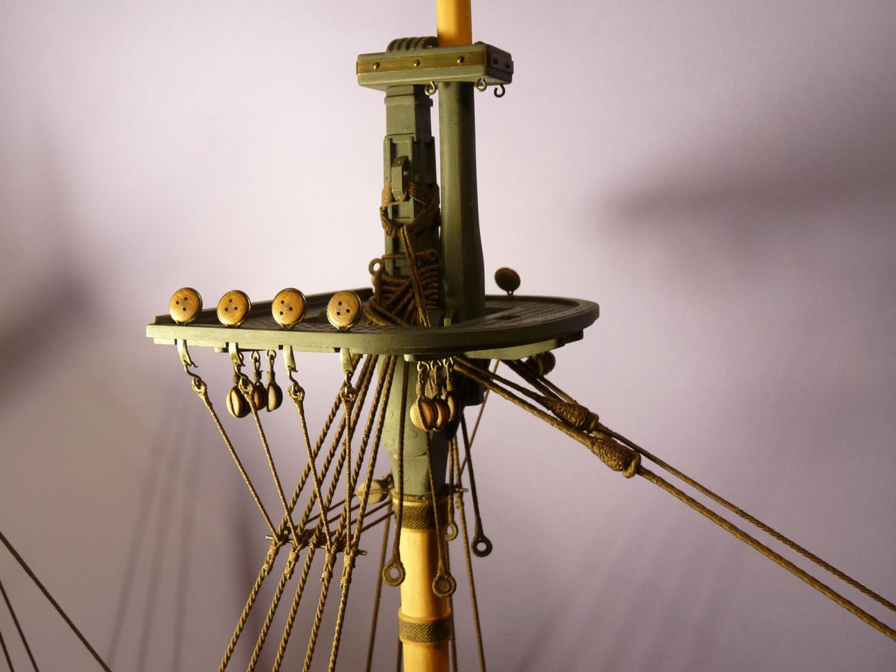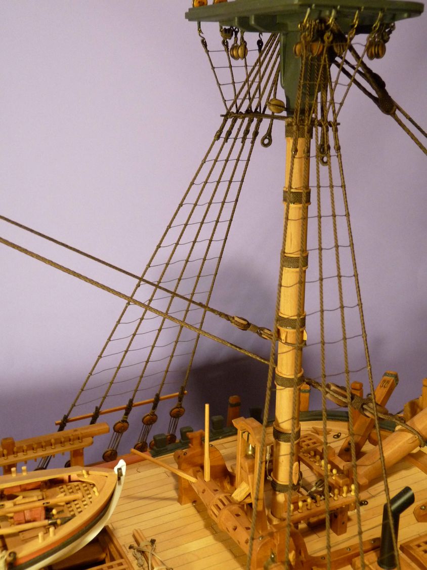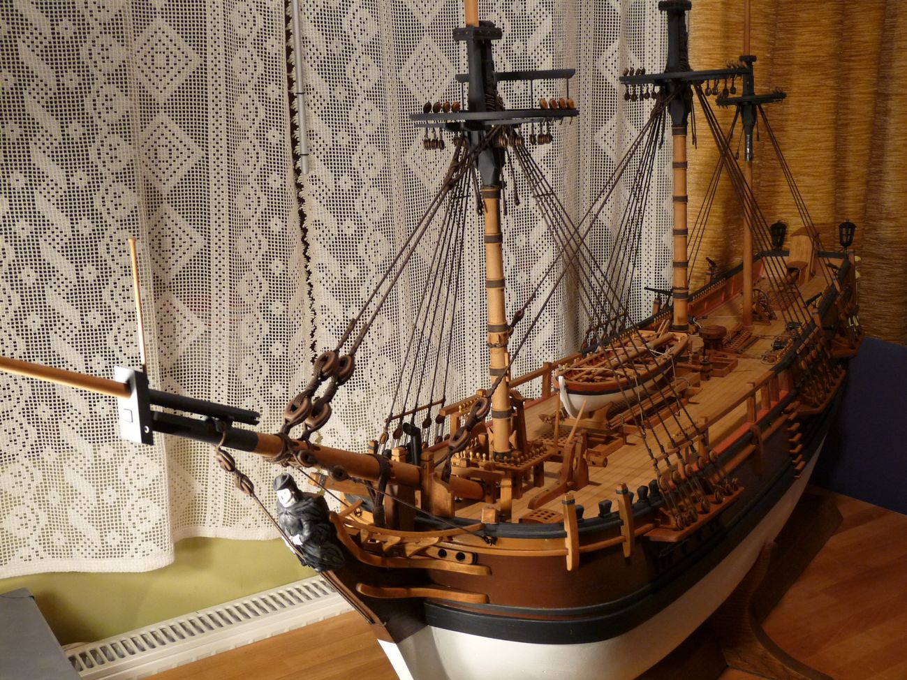 Kolor poszczegolnych linek olinowania zalezny jest od Ciebie - to Twoj model, pamietaj jednak, ze tak wanty jak i wyblinki nalezaly do olinowania stalego - czyli kolor ciemny (prawie czarny) - tzw. smola sztokholmska.