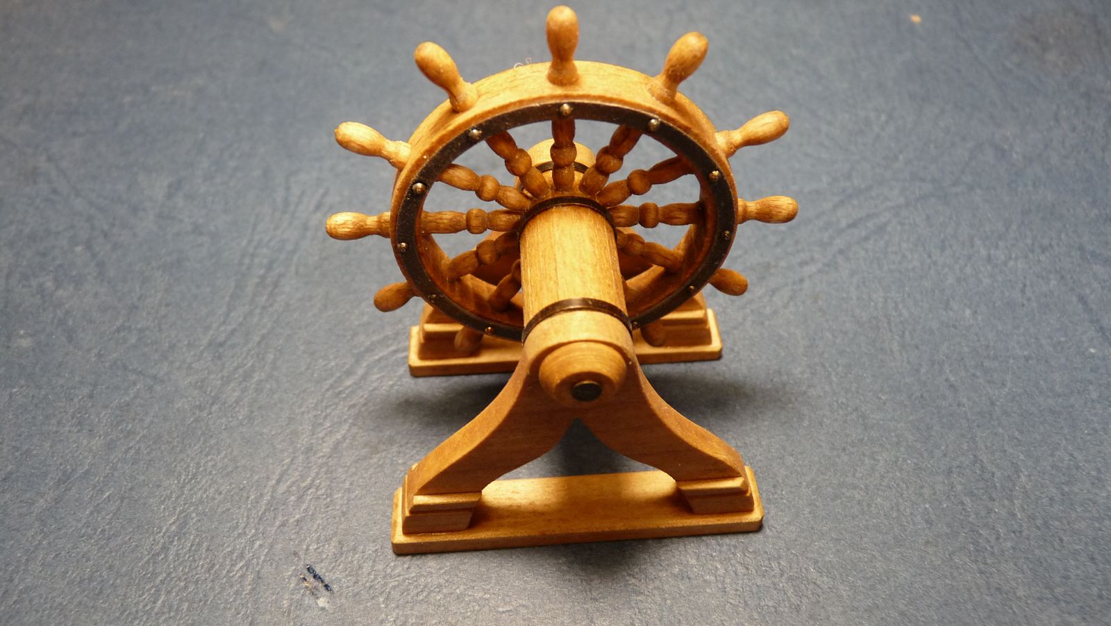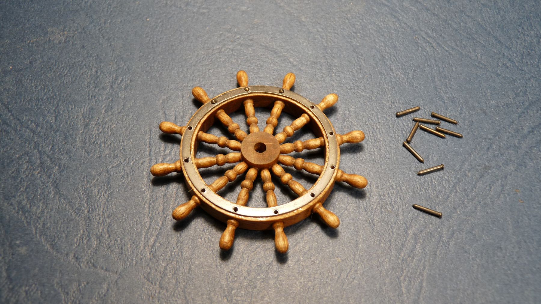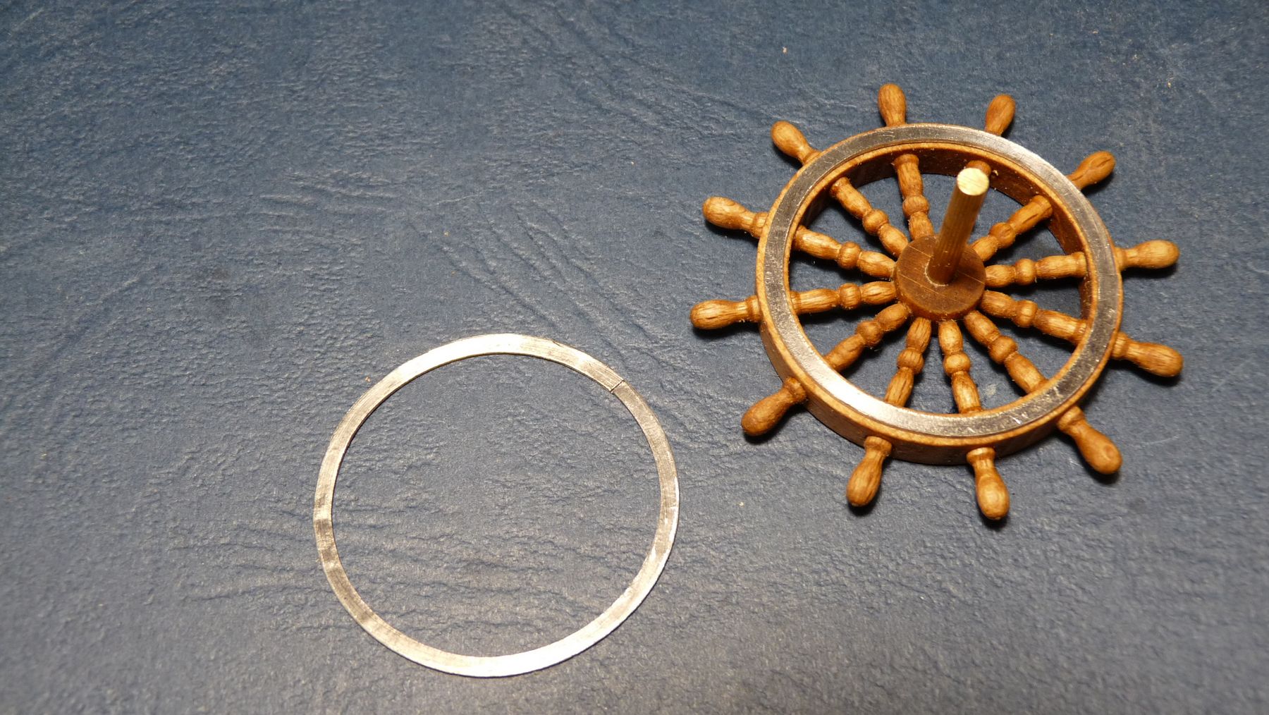 . Pogoda sprzyja, dlatego powstało dzisiaj koło sterowe. Koło jest kupione, ponieważ próby z mosiądzem zawiodły do okucia użyłem nieekologicznego ołowiu, ołów jest poczerniony i wypolerowany. Koło ma 54mm.