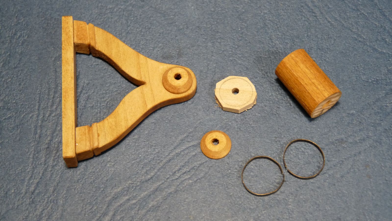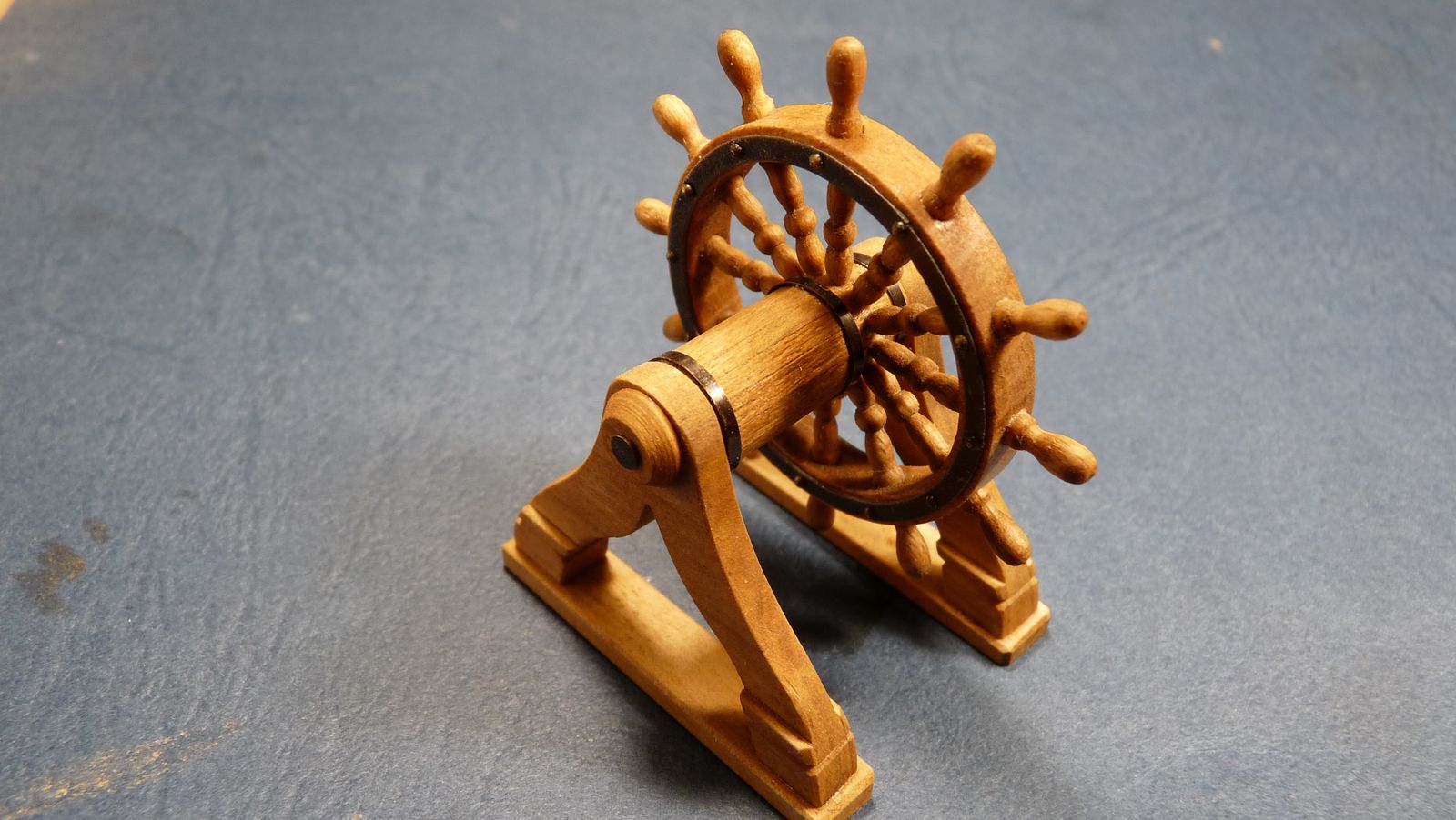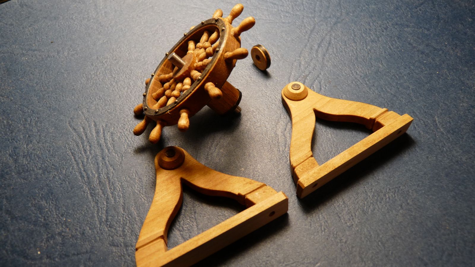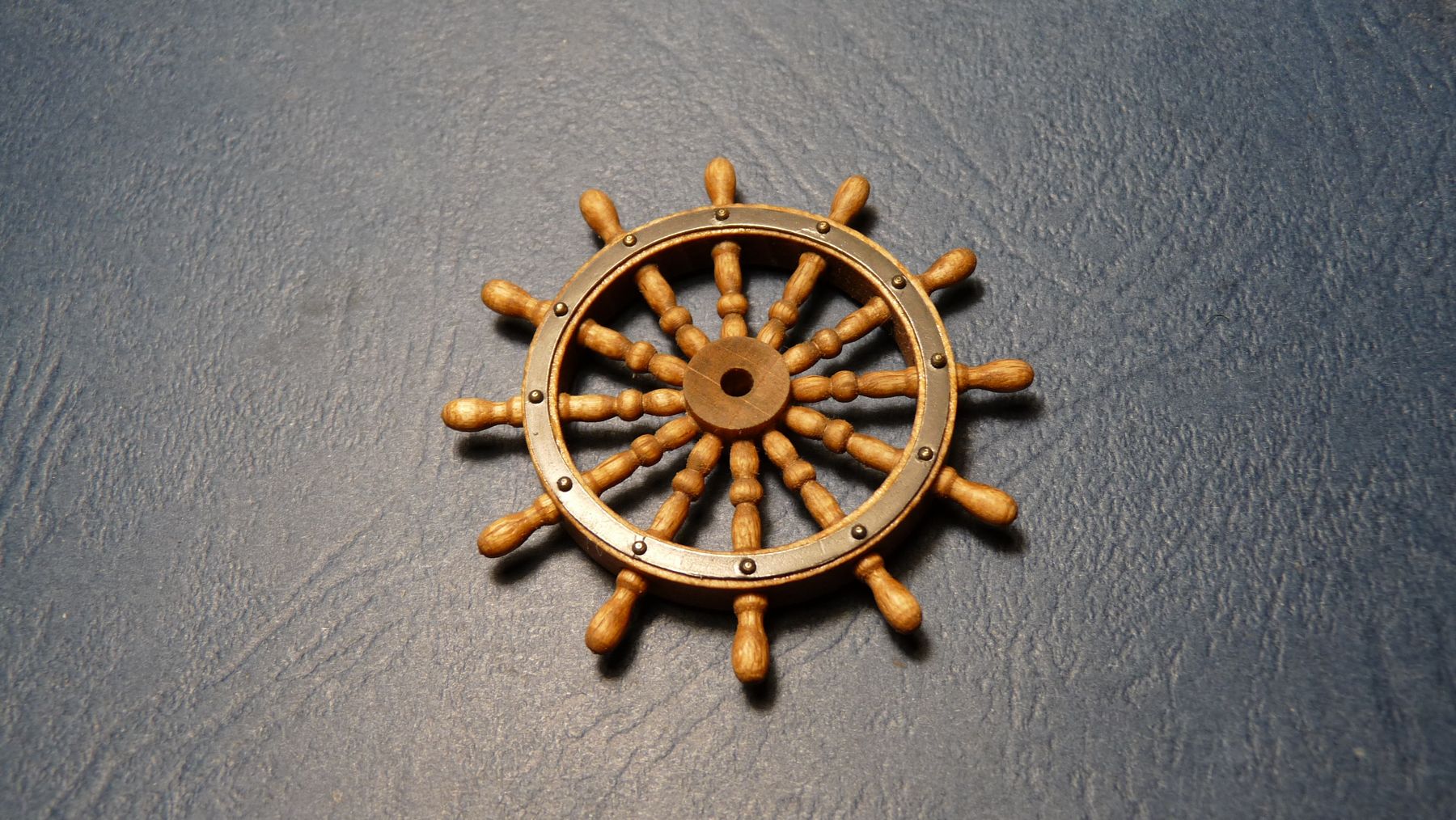 . Pogoda sprzyja, dlatego powstało dzisiaj koło sterowe. Koło jest kupione, ponieważ próby z mosiądzem zawiodły do okucia użyłem nieekologicznego ołowiu, ołów jest poczerniony i wypolerowany. Koło ma 54mm.