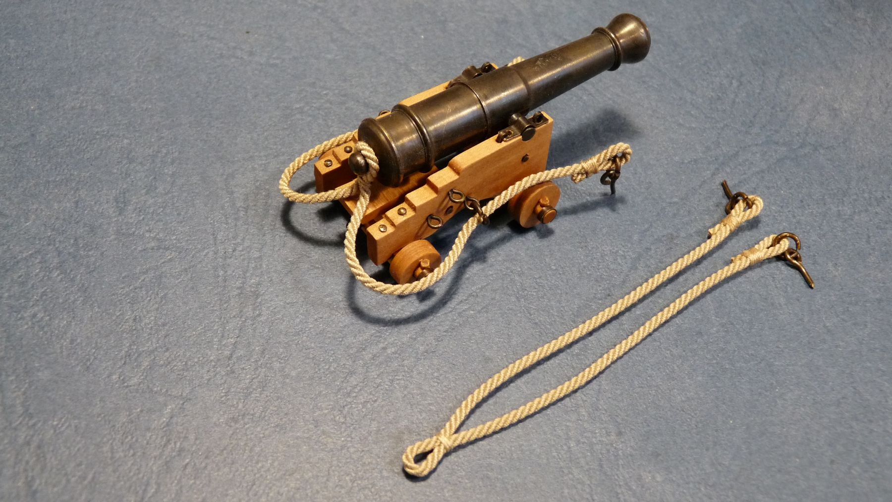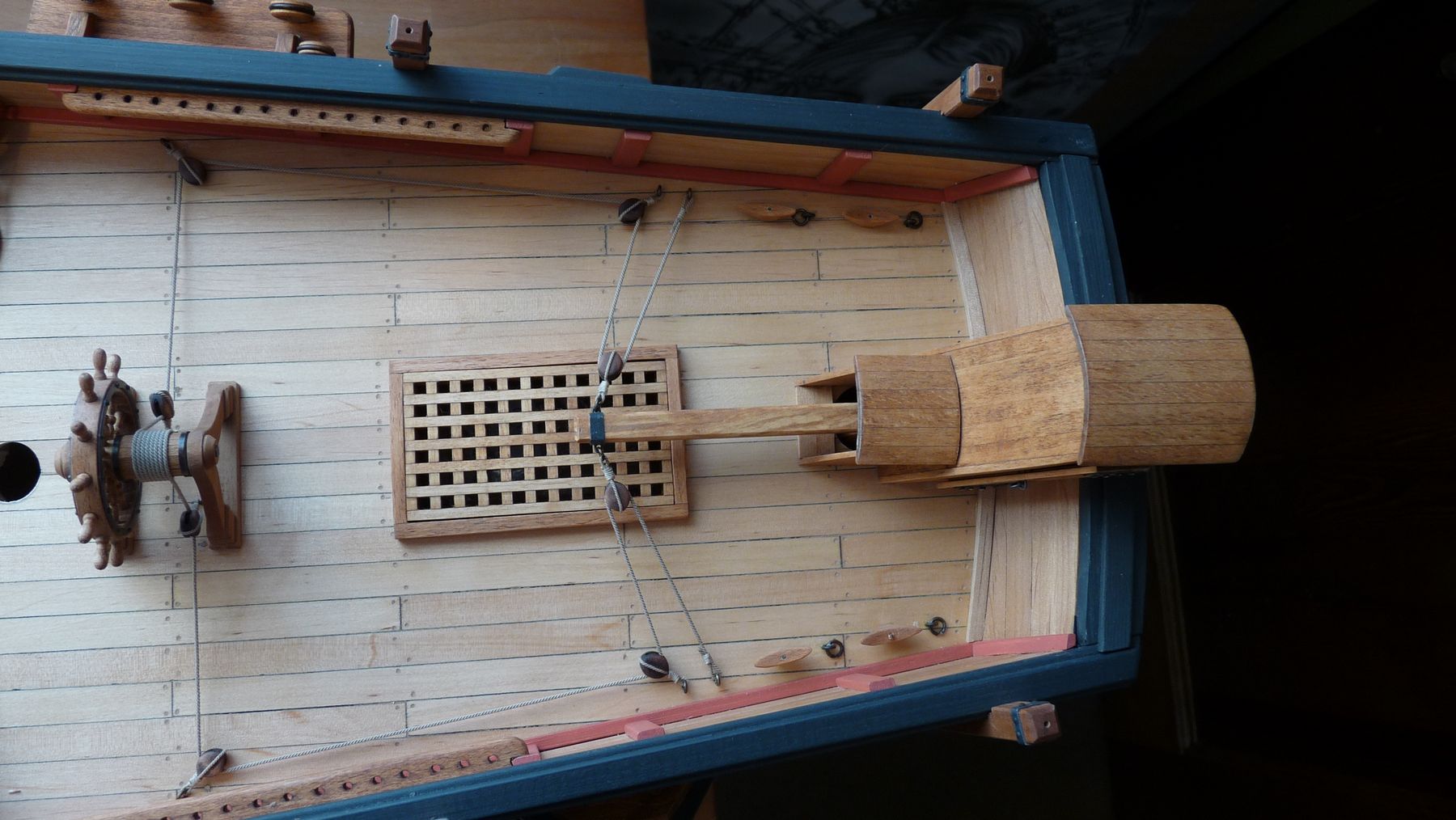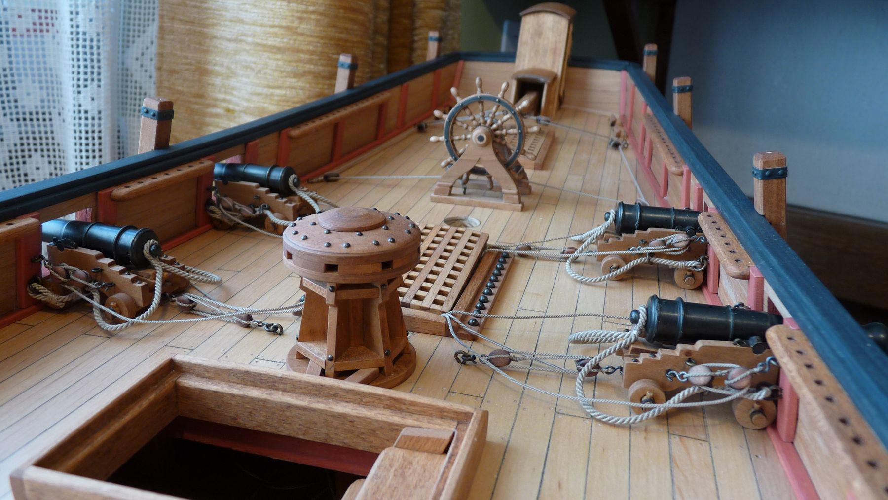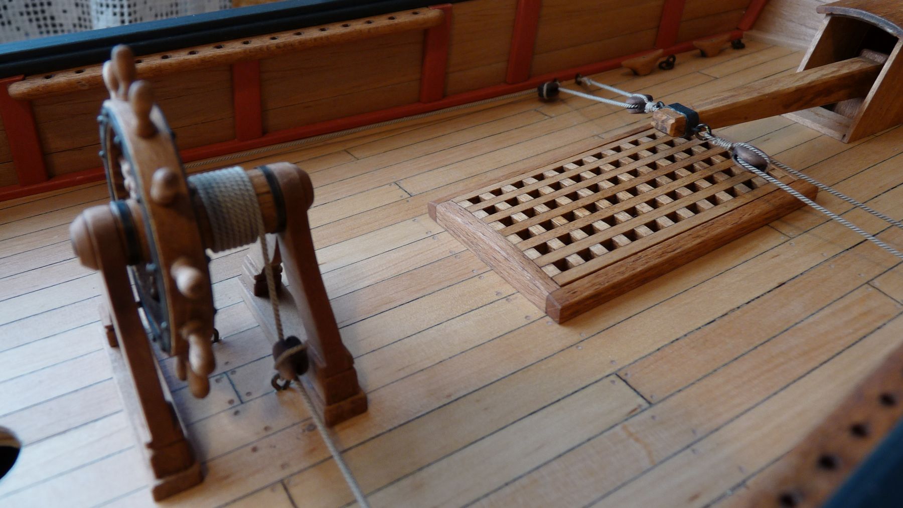 Do koła sterowego użyłem bloków 8 mm i liny 0.9 mm. Przy armatach są bloki pojedyncze i podwójne 6 mm oraz liny 0.7 mm i 1.6 mm, liny zrobiłem sam a bloczki od Mirka.