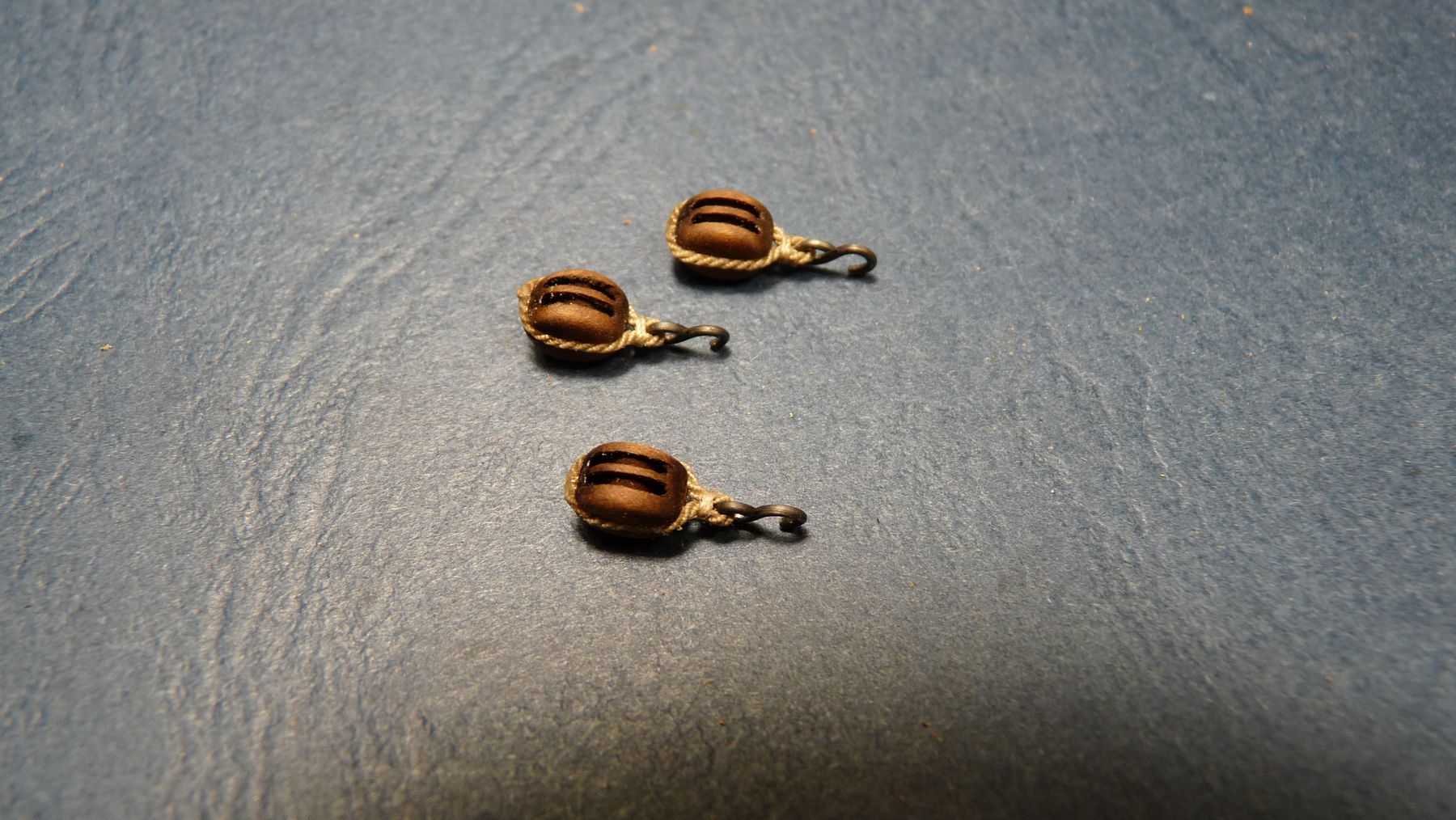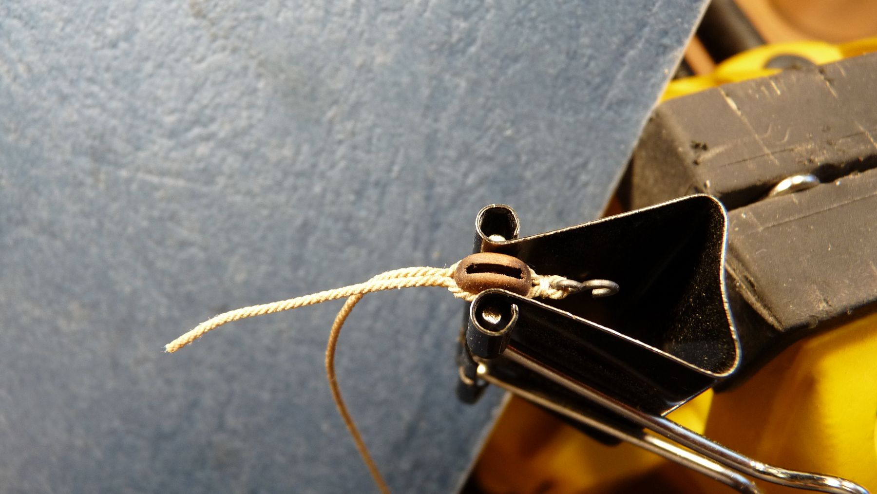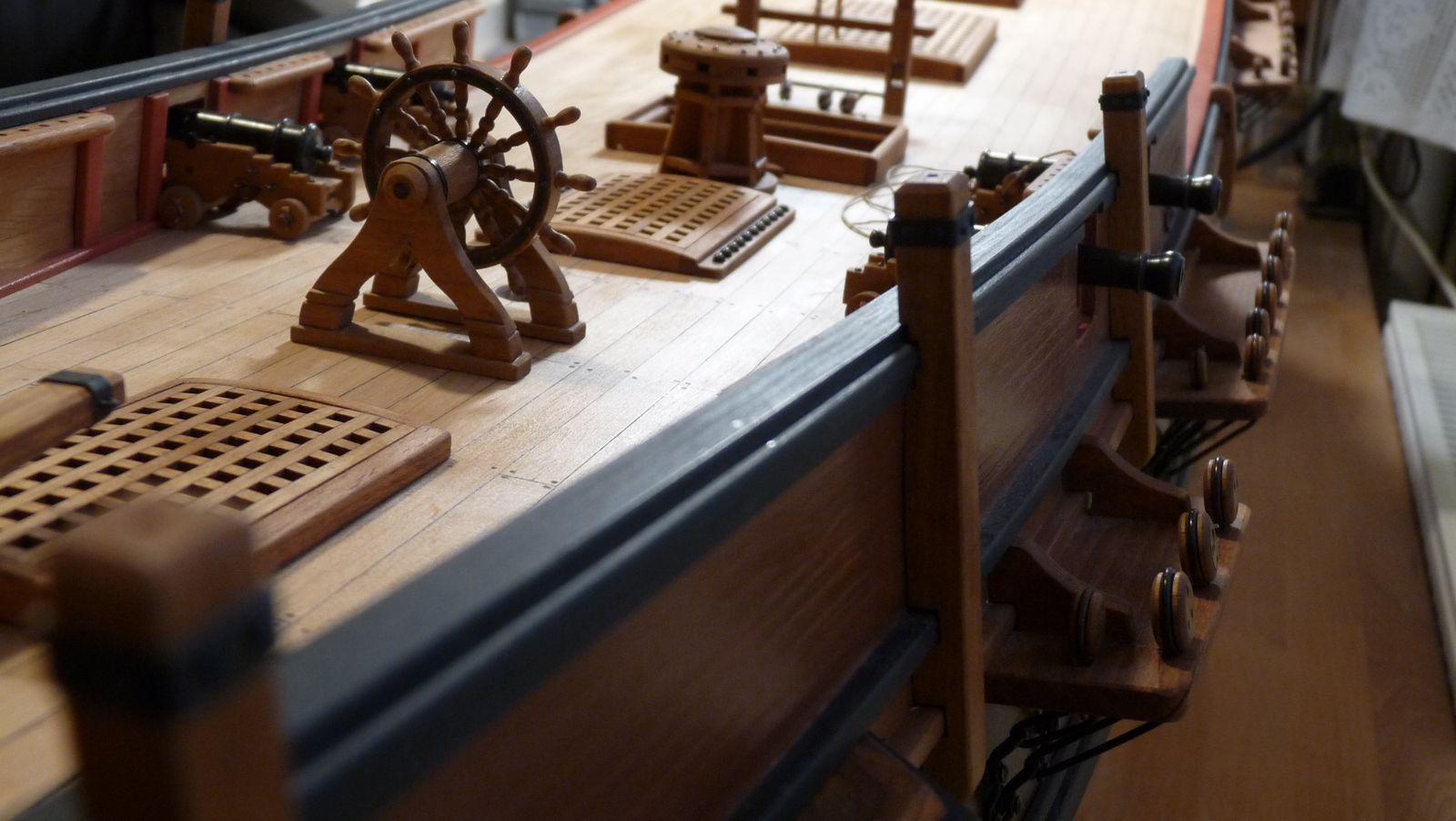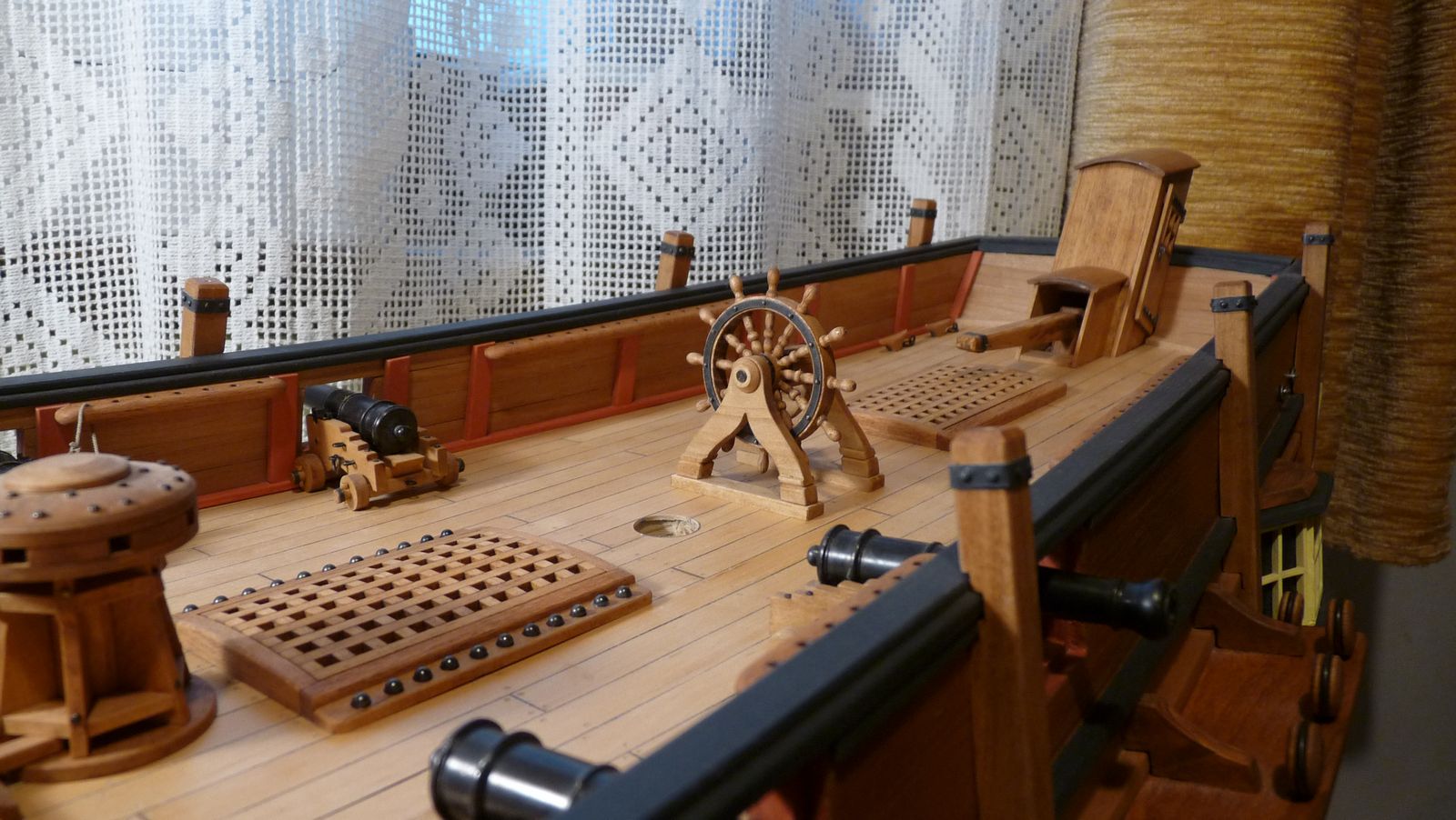 Do koła sterowego użyłem bloków 8 mm i liny 0.9 mm. Przy armatach są bloki pojedyncze i podwójne 6 mm oraz liny 0.7 mm i 1.6 mm, liny zrobiłem sam a bloczki od Mirka.