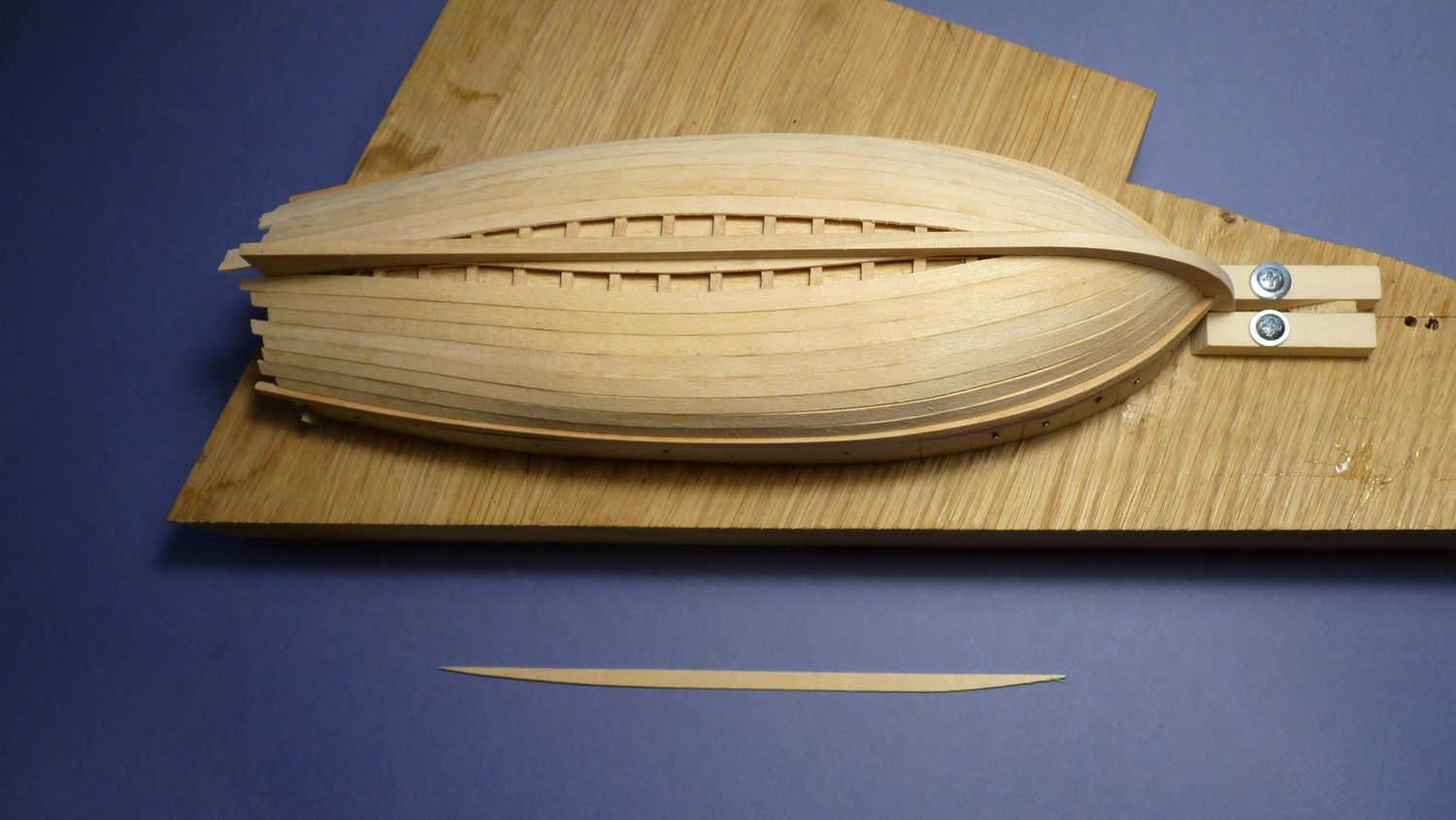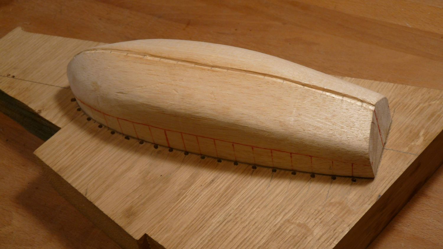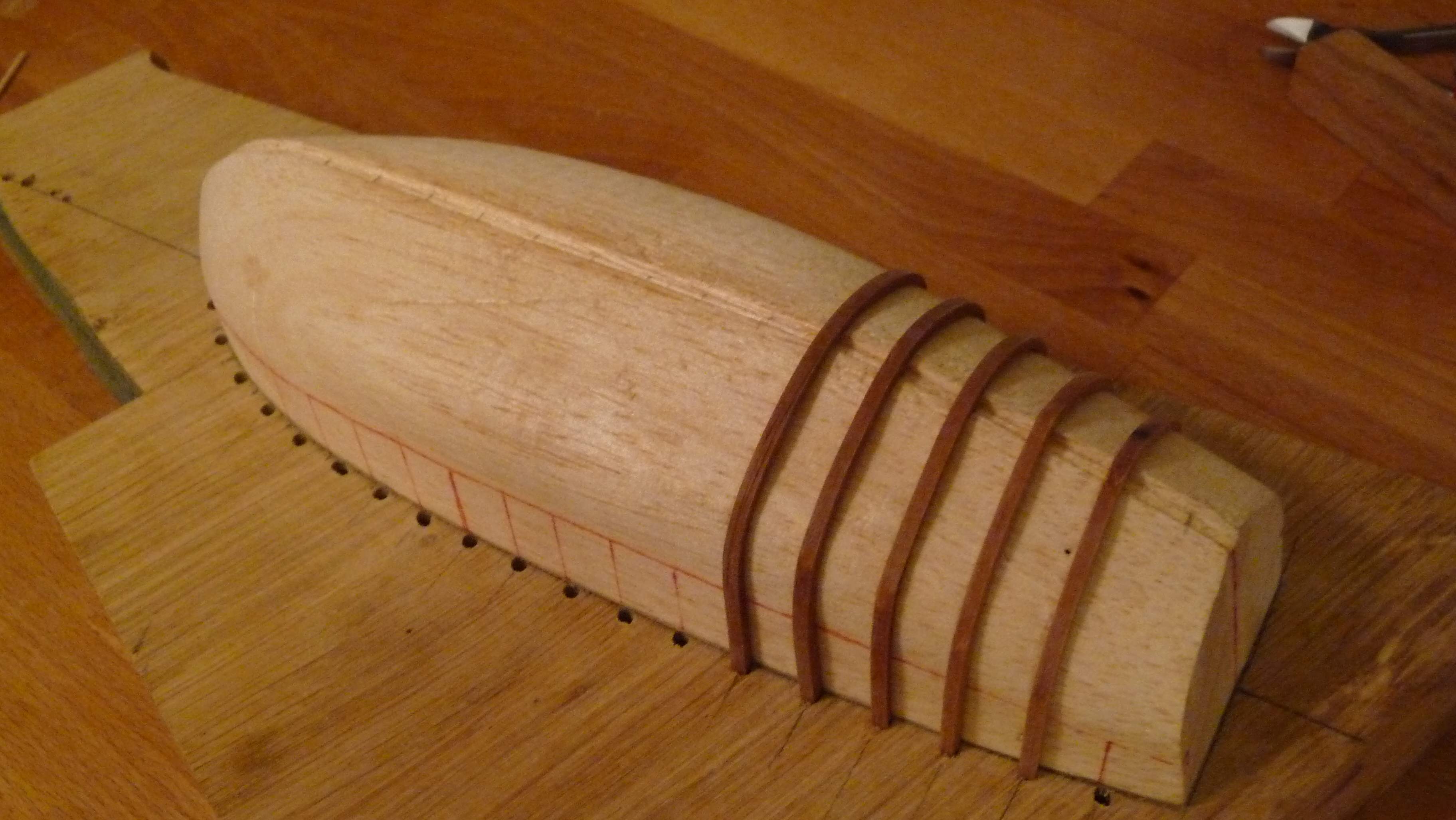 Ja mogę jeszcze tylko dodać od siebie, że przed montowaniem szkieletu łodzi zalecanym jest całe kopyto powlec ze dwa razy warstwami błyszczącego lakieru bezbarwnego aby potem łatwiej móc zdjąć poszyty już szkielet łodzi z tego kopyta, w przeciwnym razie szkielet łodzi może zostać przypadkowo przyklejony do kopyta i będą trudności z jego odseparowaniem.