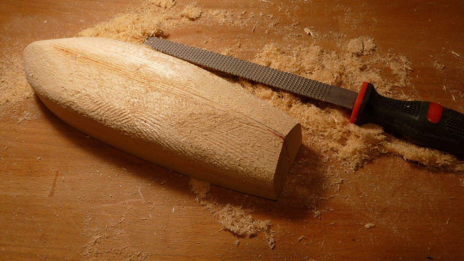Po oklejeniu i odcięciu od kopyta wyszła mi jak na pierwszy raz całkiem przyzwoita łódka w stanie „surowym”