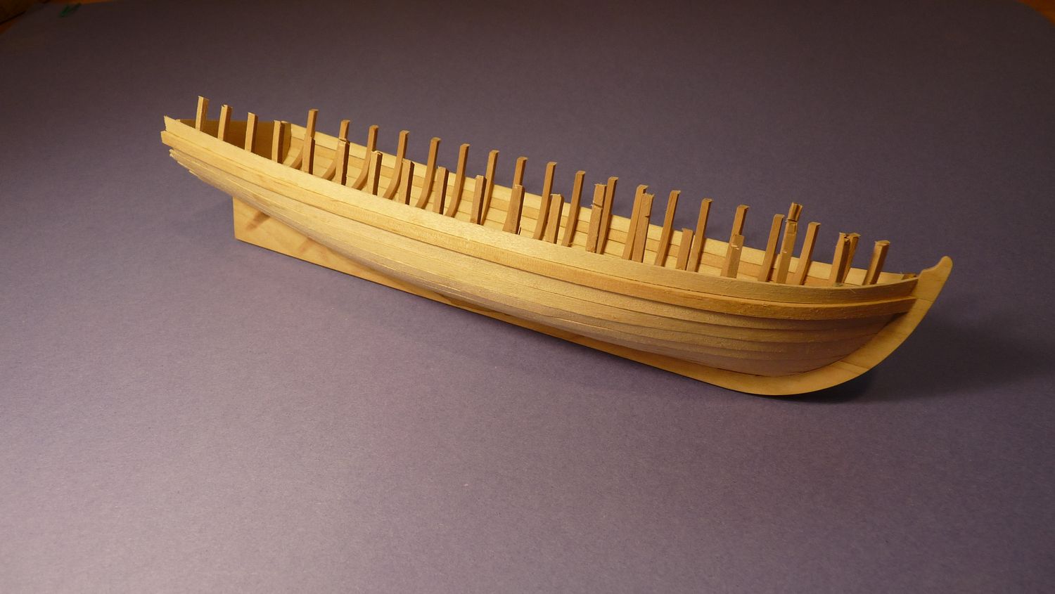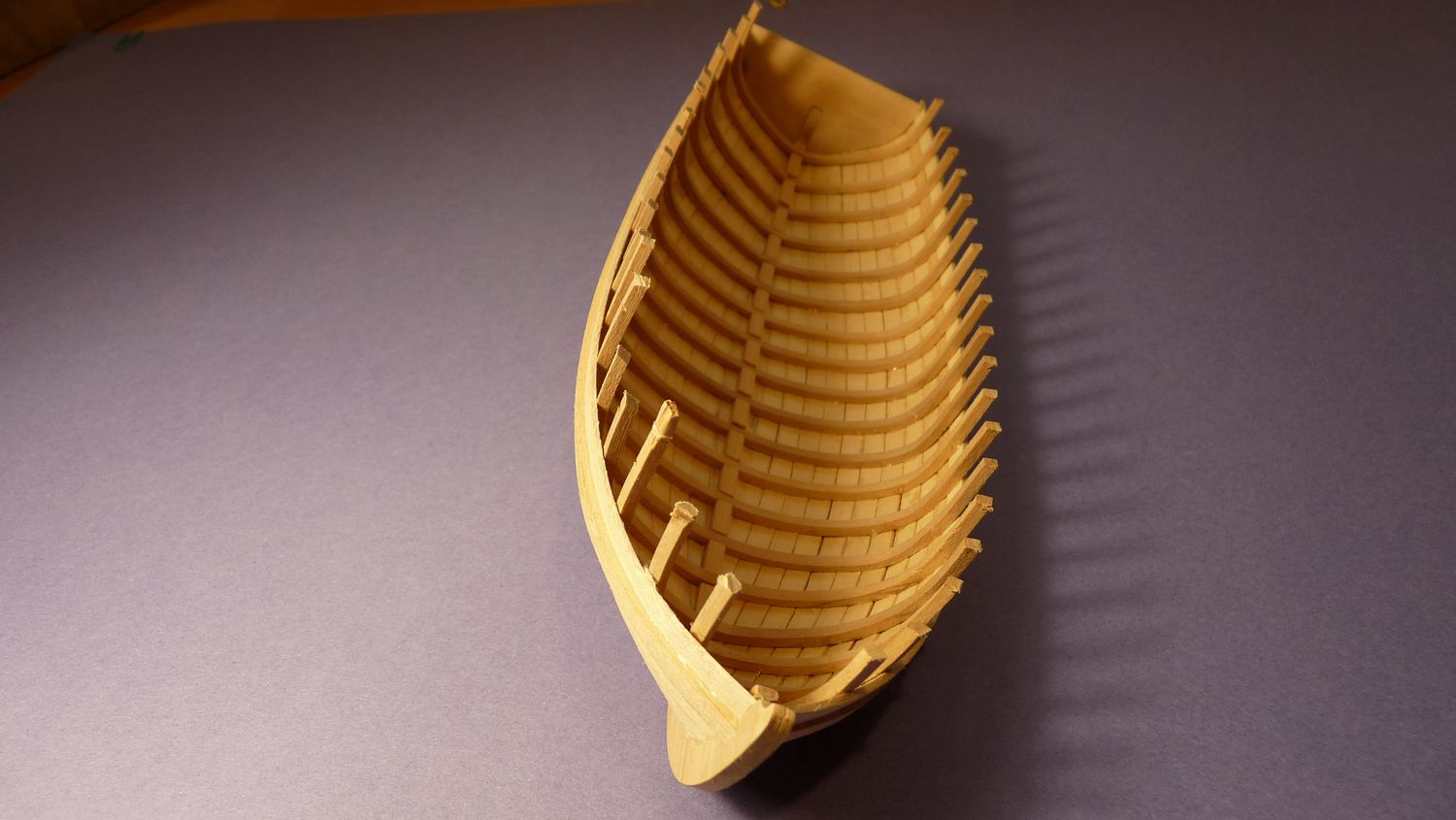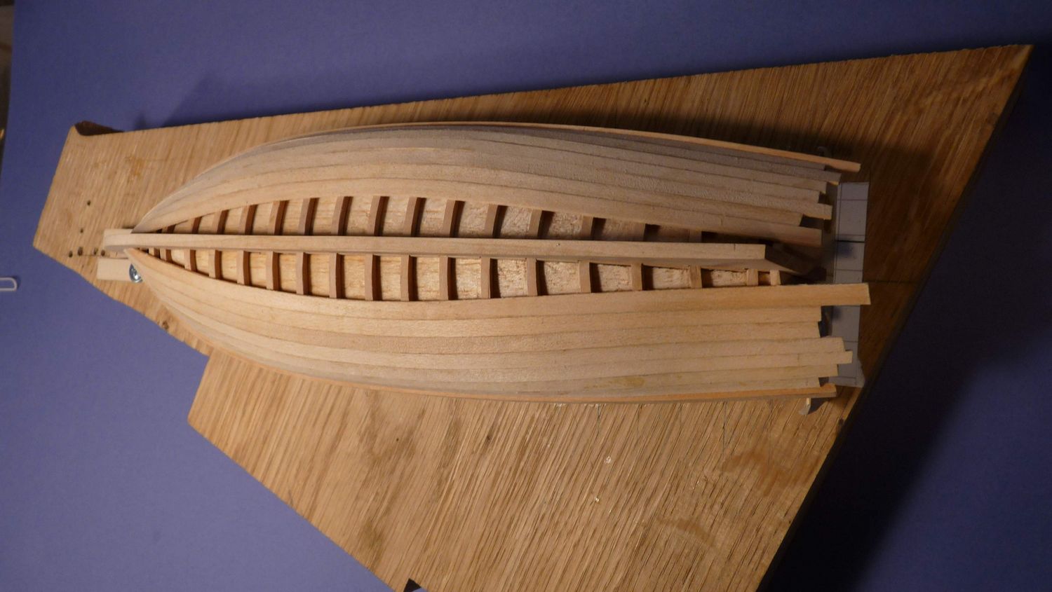 Po przyklejeniu stępki na lewej i prawej burcie przyczepiłem szablon, który pozwolił na równe i symetryczne przyklejenie pierwszych planek.