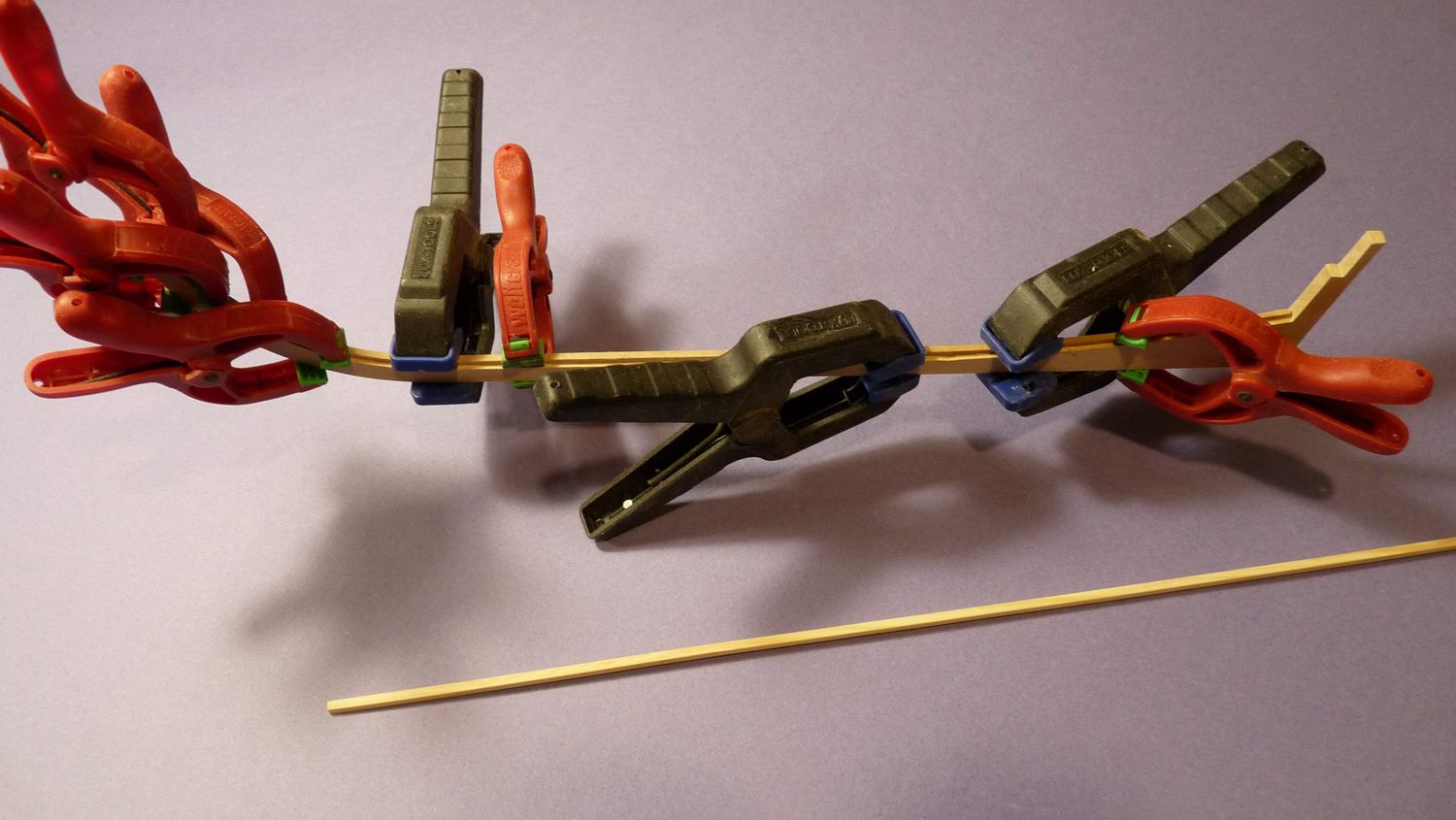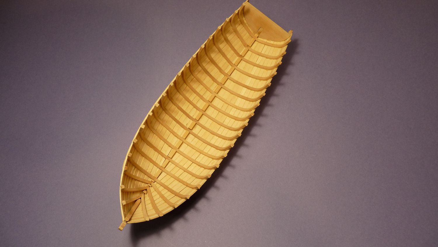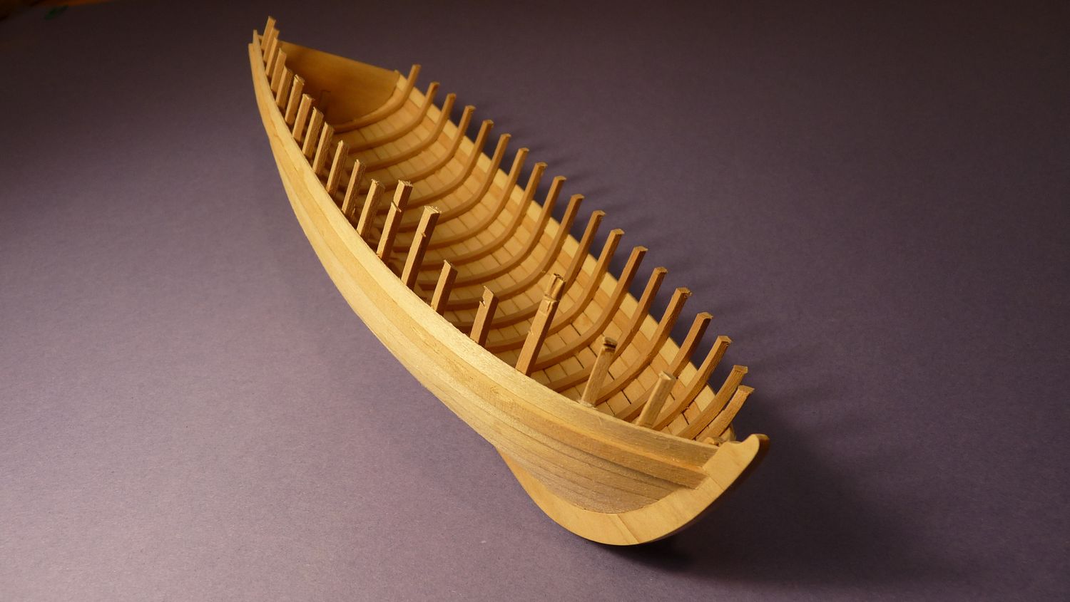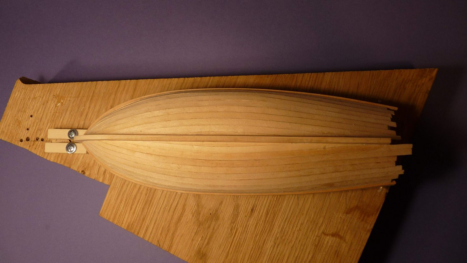 Po przyklejeniu stępki na lewej i prawej burcie przyczepiłem szablon, który pozwolił na równe i symetryczne przyklejenie pierwszych planek.