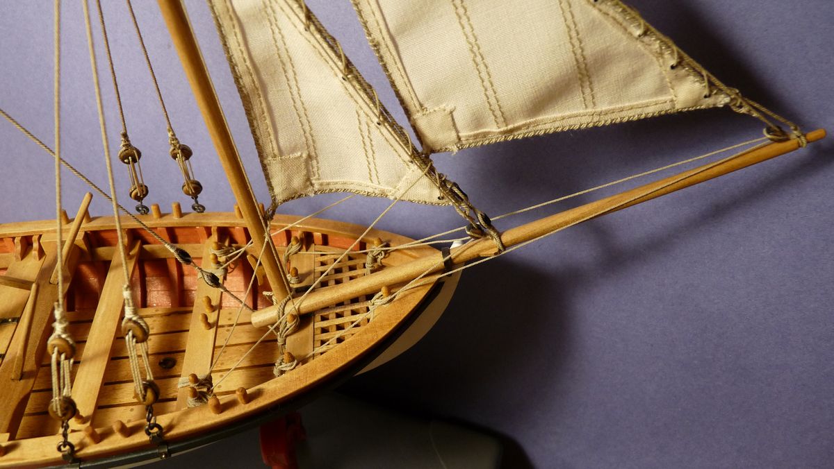 Zamontowałem na rei podwójny blok, który służy do podciągania i opuszczania żagla. Nigdzie na szalupach tego rozwiązania nie widziałem, sam to wymyśliłem, może to opatentuję. :D