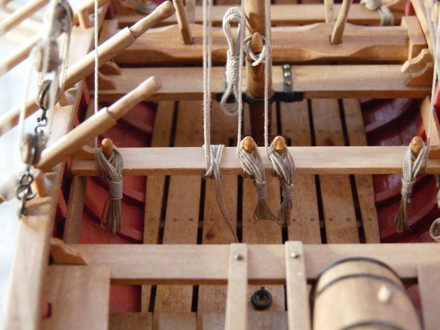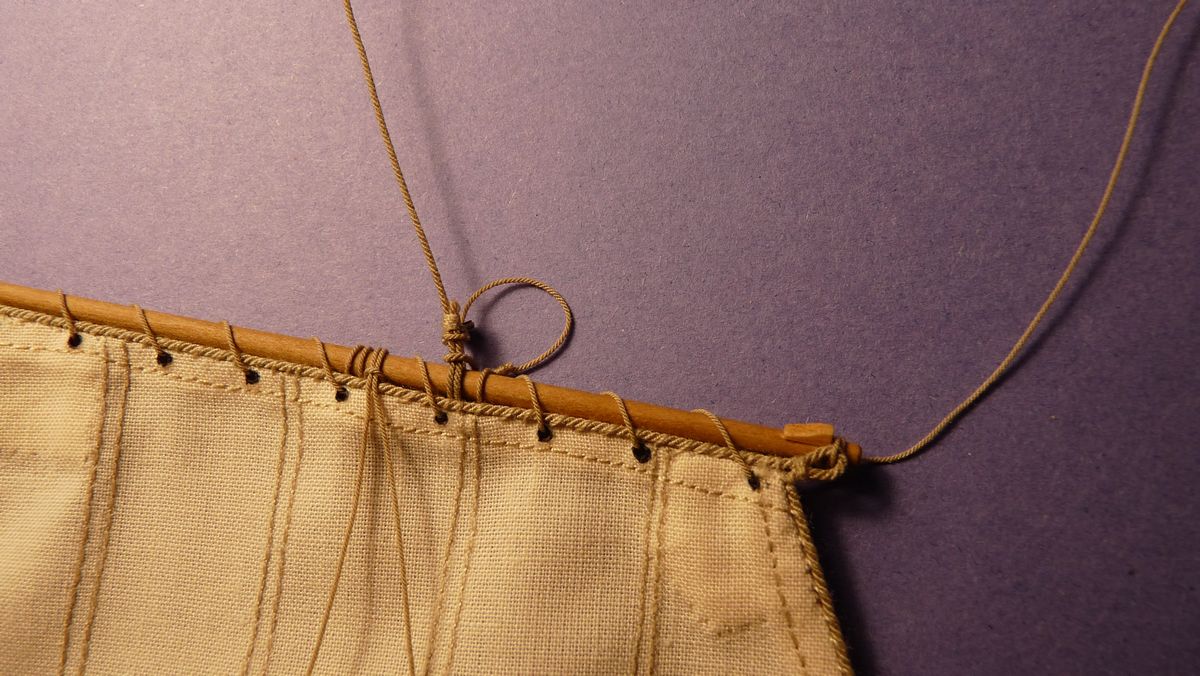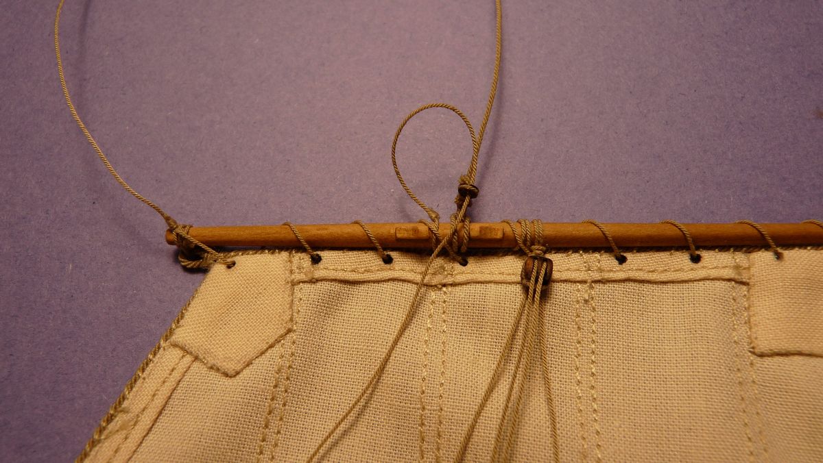 Do przytrzymania rei do masztu użyłem takiego rozwiązania jak widać na zdjęciach ( kausza przymocowana do fału ). Bardzo podobne rozwiązanie było na jednostkach brytyjskich po około 1775 roku.