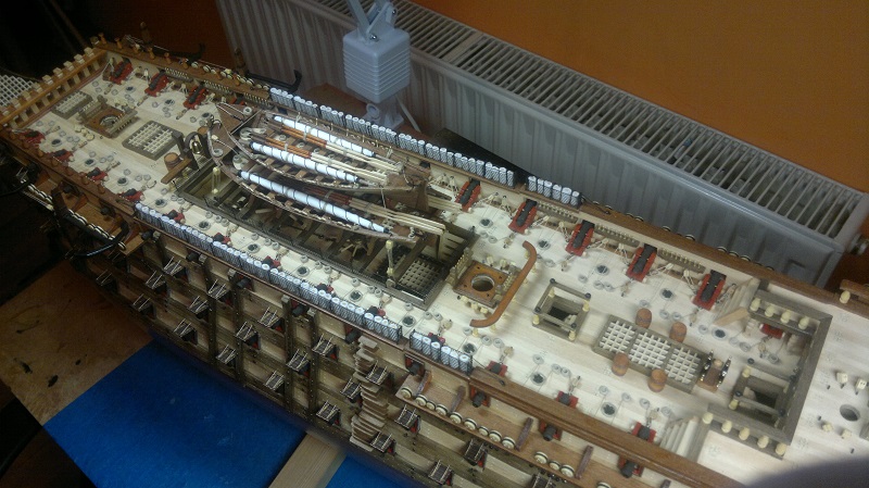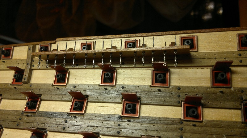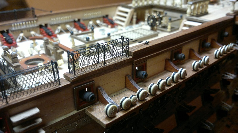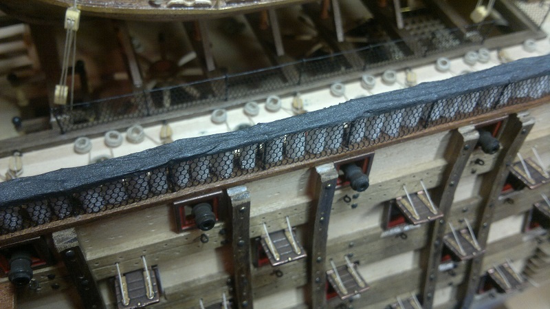 Hmmm... teraz jak to nazwać.. waloryzacja chyba bo inne słowo nie przychodzi na myśl. Jakieś zabezpieczenia by załoga nie powpadała Zastosowałem szpilki z oczkami potraktowane oksydą. Siateczka docięta na wymiar potem do kupy wszystko razem. Dodałem też zwinięte z linek pojemniczki na kule armatnie.