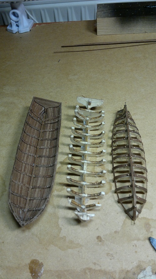 SZALUPY ! Tu od razu się przyznam że miałem dylemat jak te małe łódeczki wykonać. Forum i inne strony przewertowane i pytanie.. Czy robić jak w instrukcji czy coś więcej od siebie wymagać. Raz się żyje haha Wspomnę że wzorowałem się na waszych relacjach. Tylko że ja to troszeczkę inaczej zrobiłem. A więc na sam początek szkielet szalupy. Następnie taśma samoprzylepna w celu oklejenia żebrowania. Tu już wykorzystałem listewki fornirowe które przecinałem na pół i pokrywałem na zakładkę. (Listewka 4mm dzielona na 2mm a sama zakładka około 1mm )Przed każdym gwoździkiem wierciłem wiertełkiem 0.6mm. A to po to by listewki fornirowe nie pękały. Potem delikatnie na gwoździkach z małym użyciem kleju (pattex). Największe obawy były przy wyciąganiu szkieletu. Naprawdę delikatnie podważając separacja okazała się dla mnie szczęśliwa. Potem kosmetyka szlifowanie lakierek itd.